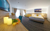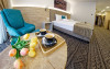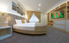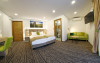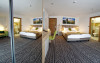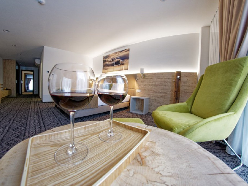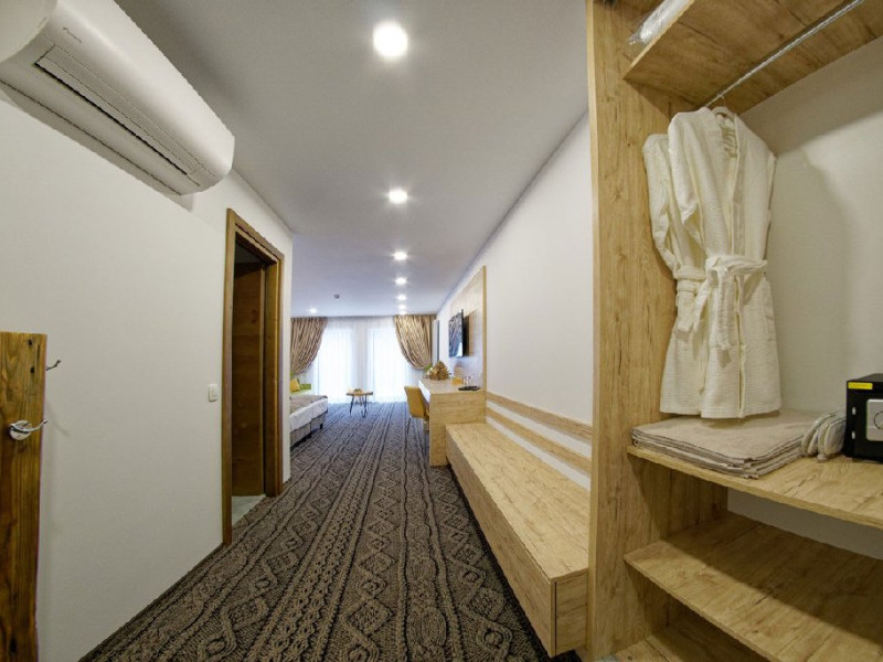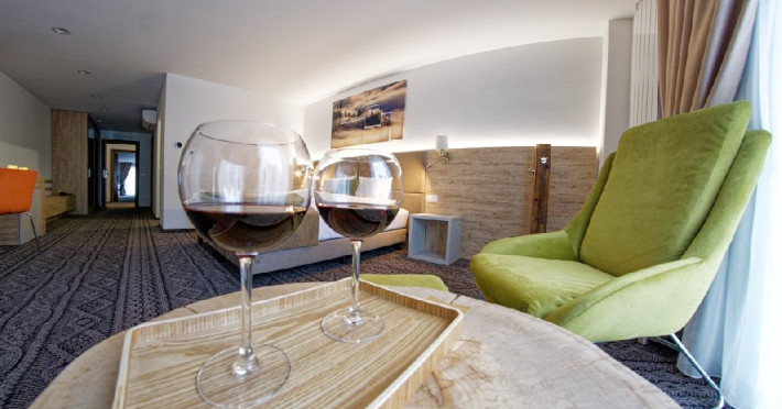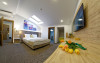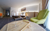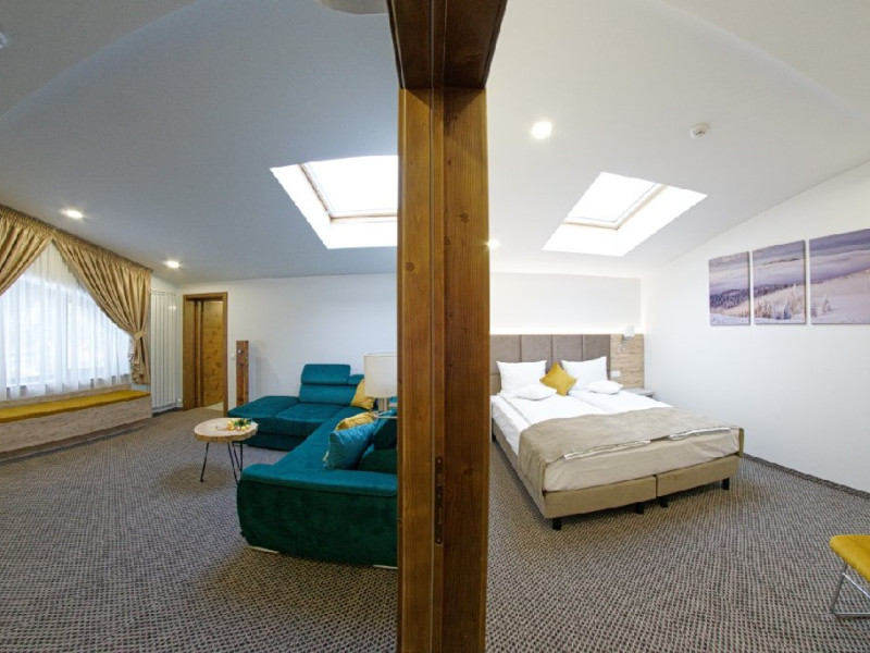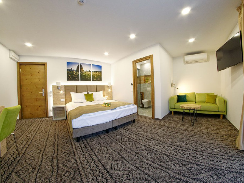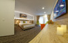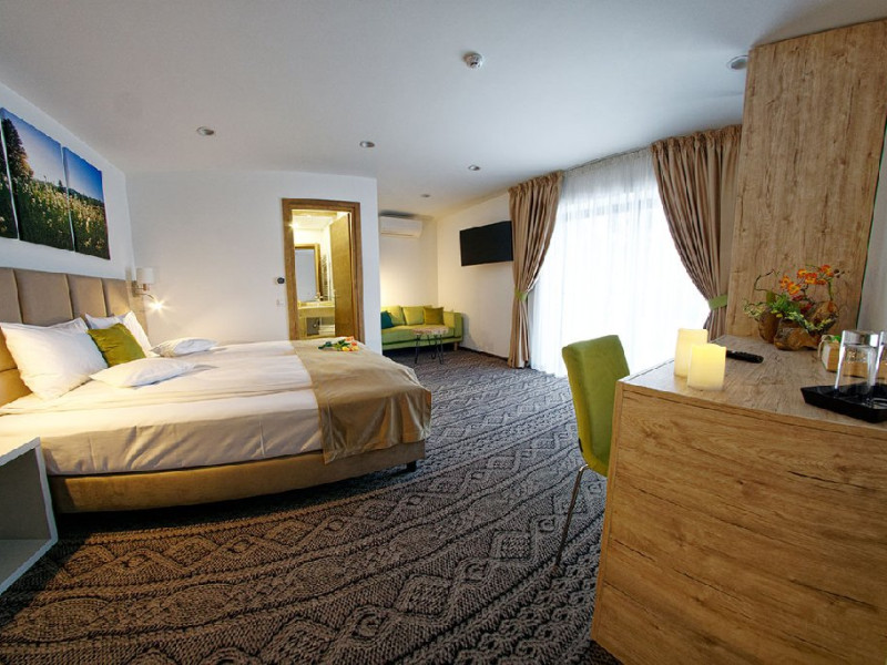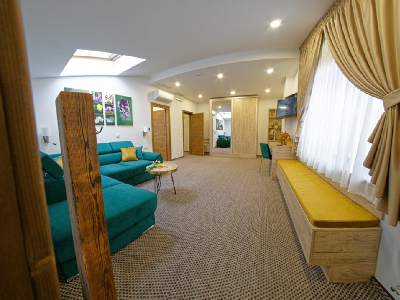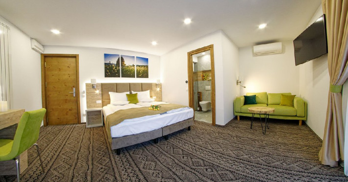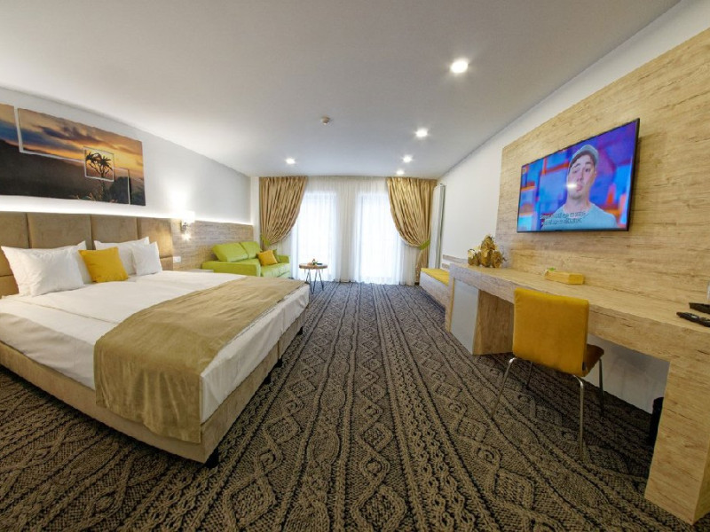 Junior Suite - suprafata generoasa, de 32 mp, compus dintr-o camera de zi spatioasa, dotata cu frigider, smartTV, canapea extensibila si o zona de dormit intima, cu pat matrimonial XL, separata de zona de zi printr-o piesa de mobilier multifunctionala, cu smartTV montat pe o placa rotativa 180 grade.