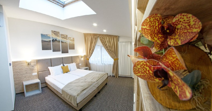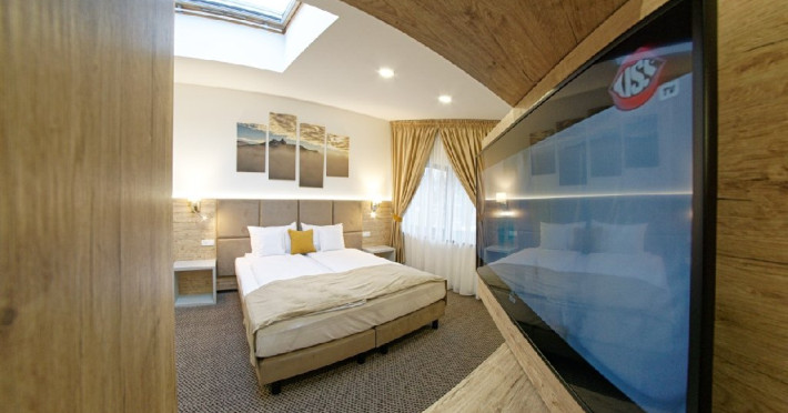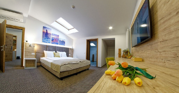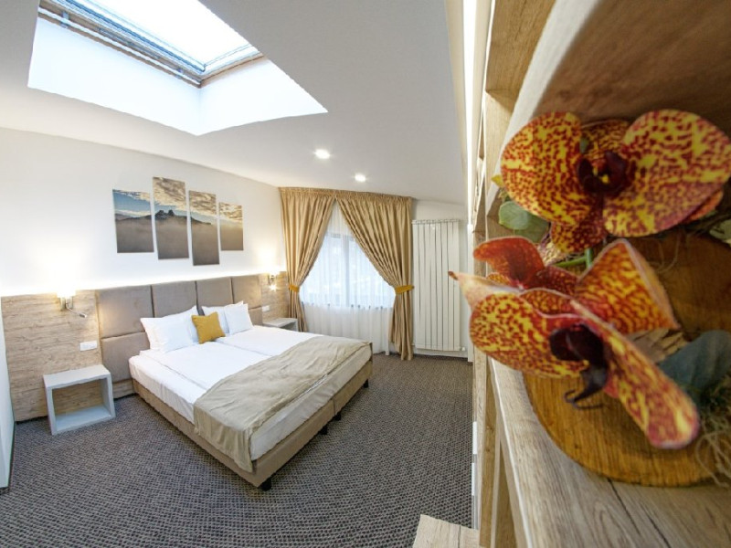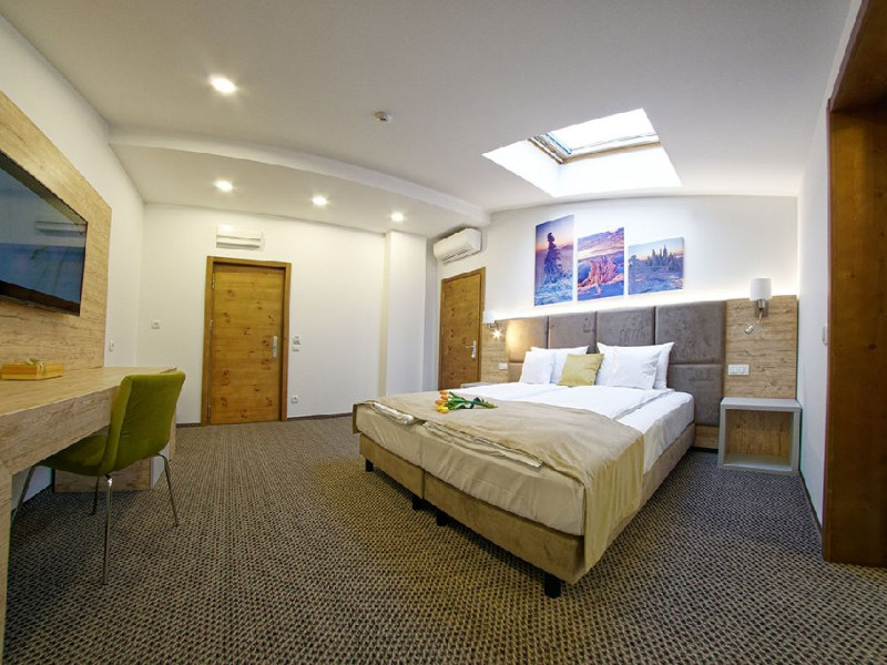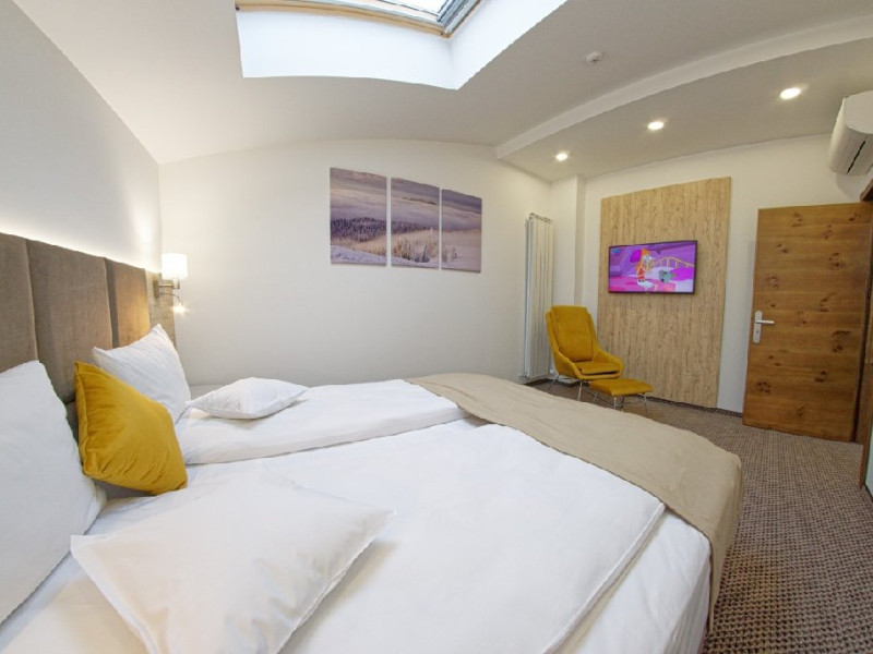 Camera dubla Simpla - camera spatioasa cu suprafata intre 16 si 23 mp., dotat cu minibar, smartTV, cu pat matrimonial XL, cu geamuri velux.