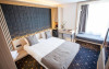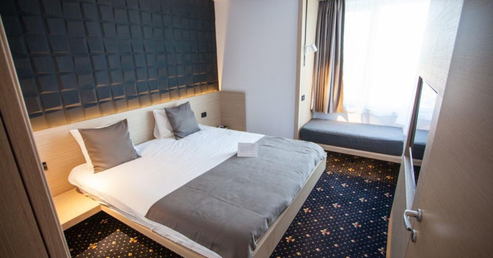Double room standard sunt situate pe latura nordica, la etajele 1 si 2 ale hotelului, cu o suprafata totala de 18 mp, si dispun de un pat matrimonial de 160/200 cm, si o sofa de 140/60 cm in dreptul geamului. Nu se poate acomoda pat suplimentar.
