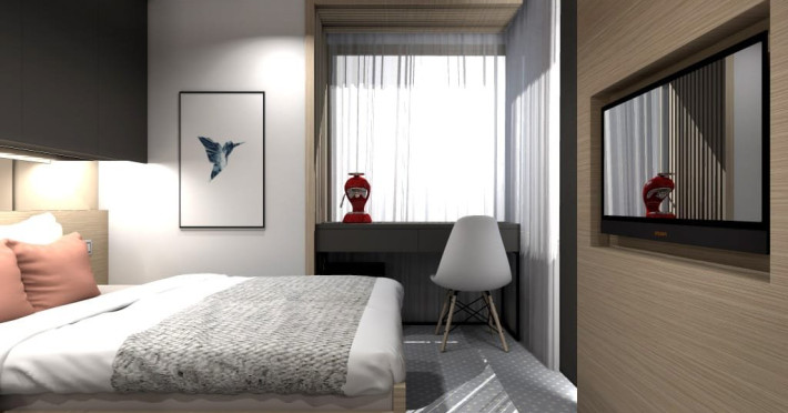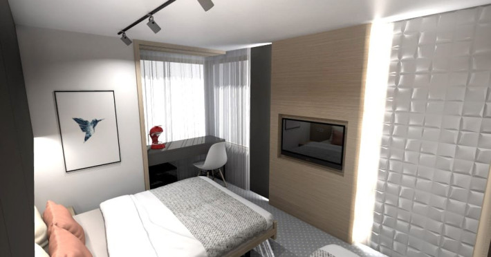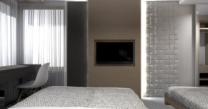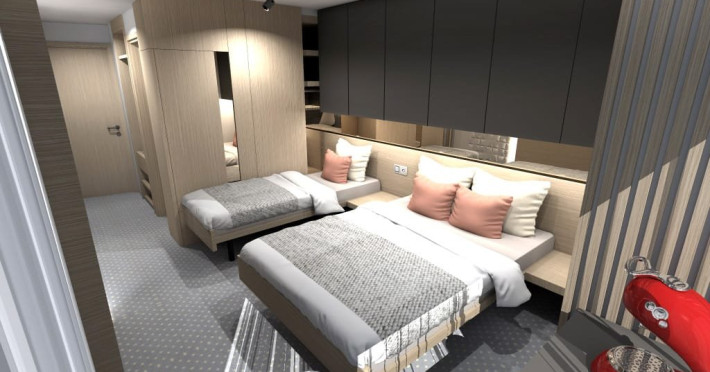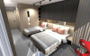 Small triple room sunt situate pe latura nordica si au o suprafata totala de 18 mp, dispun de un pat matrimonial de 140/200 cm + un pat single de 80/200 cm. In dreptul geamului sunt dotate cu un birou. Au vedere laterala la mare.