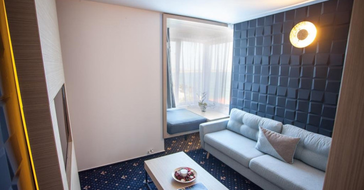 Partial sea view room superior sunt cele mai noi camere din hotel, au 18 mp, sunt pozitionate la etajele superioare ale hotelului, oferind astfel o panorama deosebita, sunt dotate cu un pat de 160/200 cm, o sofa (60/140 cm) in dreptul geamului, si au fost imbunatatite cu panouri 3D la capatul patului. Camere sunt situate la etajele 5-10. Nu se poate acomoda pat suplimentar.