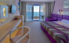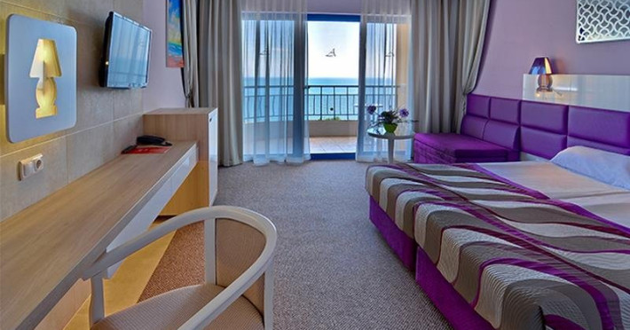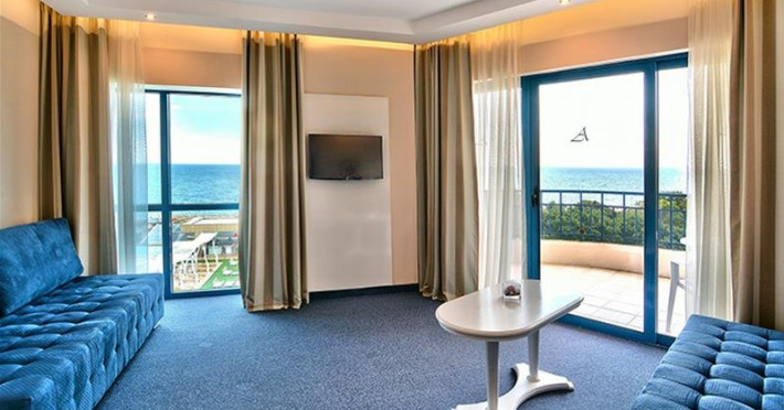 Apartamentele Junior au 35 - 45mp si dispun de facilitati pentru cazarea a maxim 3 adulti si 1 copil. Apartamentele au 50mp si ofera cazare pentru maxim 4 adulti sau 2 adulti si 2 copii.Toate spatiile de cazare au vedere directa la mare sau partiala si sunt dotate cu aer conditionat, baie cu cada, uscator de par, mocheta, canapea extensibila, telefon, TV program satelit, minibar (reincarcat zilnic cu apa minerala, bauturi racoritoare si bere), seif (contra cost), balcon mobilat, WiFi (contra cost).