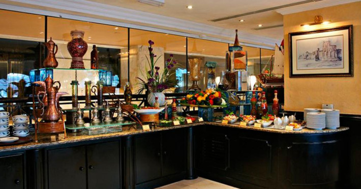 La Arabian Courtyard Hotel & Spa oaspeții au la dispoziție 3 restaurante unde pot savura mâncăruri delicioase, în stil bufet sau à la carte. Preparate din bucătăria internațională așteaptă să fie degustate în fiecare zi la micul dejun, prânz și cină. Masa poate fi servită atât în interior, cît si în aer liber, pe terasă, în funcție de vreme. 2 baruri, dintre care unul la piscină, sunt disponibile cu o ofertă variată de băuturi răcoritoare și alcoolice. În cadrul proprietății există și o cafenea ideală pentru o gustare rapidă. Pentru cei cu anumite nevoi de nutriție, Arabian Courtyard Hotel & Spa oferă meniuri pentru diete speciale.