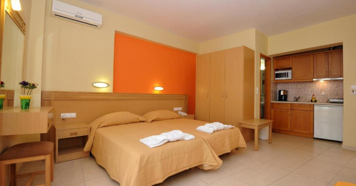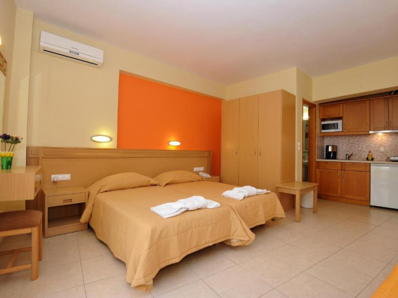 Toate studiourile și apartamentele de la Hotelul Aristea sunt dotate cu aer condiționat și au o bucătărie complet utilată și o baie privată. Fiecare are balcon sau terasă cu vedere la grădină, la terasă, la piscină sau chiar la mare, in funcție de unitate.