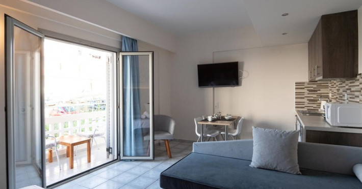 Apartamentele sunt situate aproape de plaja Limenas Hersonissou, la 350 de metri. Centrul orasului este aproape de locatie cu magazine, farmacii, restaurante si cafenele. Cel mai apropiat aeroport se afla la o distanta de aproximativ 20 de km.