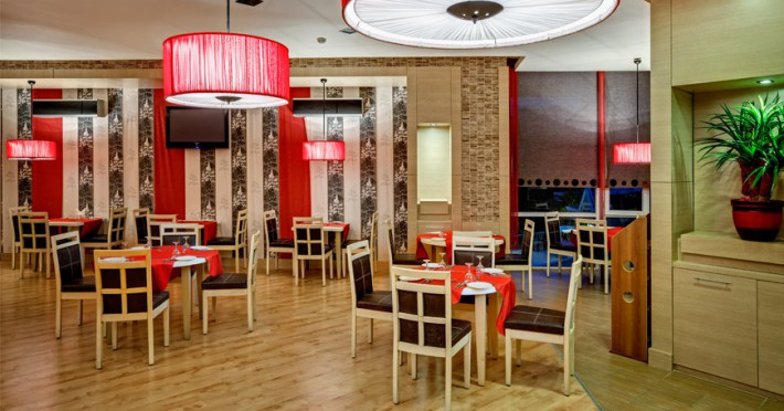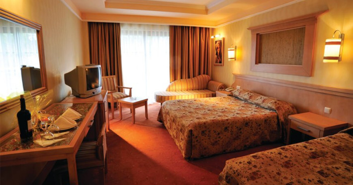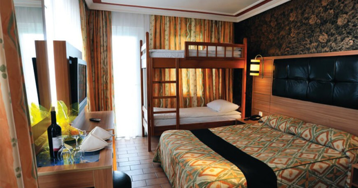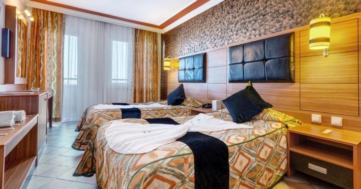 Facilitati Camere: Hotelul are 2 cladiri cu 6 etaje si 380 de camere standard ( dubla sau twin si canapee, 23 mp, ocupare maxima 2 adulti si 2 copii). Toate camerele vin dotate cu baie cu dus sau cada, LCD TV, AC, uscator de par, seif (contra cost), balcon, telefon, minibar (bauturi racoritoare si fructe in ziua cazarii, gratuit). Curatenia se face zilnic iar schimbarea lenjeriei se face de 3 ori pe saptamana.