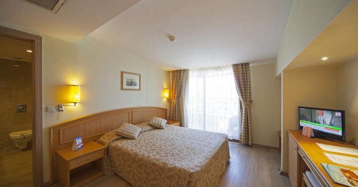 Hotelul are un numar tota de 186 camere: camere Standard (18-25mp, un dormitor cu pat matrimonial + un pat twin + canapea, o baie, max.2+1pax), camere Junior suit (30-39mp, un dormitor cu pat French + un pat twin + canapea, max.4pax). Toate camerele au baie privata cu cada sau dus, hair dryer, aer conditionat centralizat cu program in functie de conditiile meteo, mini bar (bauturi racoritoare numai la sosire), seif (contra cost), gresie sau parchet laminat, LCD TV prin satelit, balcon in camerele cu vedere la mare si balcon tip French in camerele cu vedere la gradina.