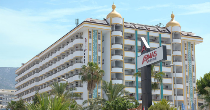 Localizat in statiunea Alanya, hotelul Armas Prestige este la 130 km de aeroportul din Antalya si la 10 km de centrul orasului Alanya. Plaja privata este la 150 m de proprietate, accesul se face prin tunel subteran. Plaja si piscina exterioara sunt dotate cu sezlonguri si umbrele de soare. Restaurantul a la carte si restaurantul principal servesc preparate locale si internationale. Oaspetii pot savura bauturi racoritoare la barul hotelului sau unul din barurile de la plaja si de la piscina. Centrul SPA ofera turistiilor servicii de masaj, sauna si baie turceasca. Copii au un loc de joaca special amenajat, mini disco, club pentru copii si carucior (contra cost).Localizare