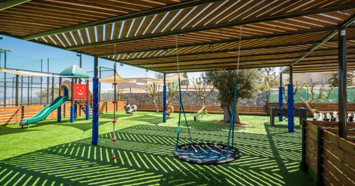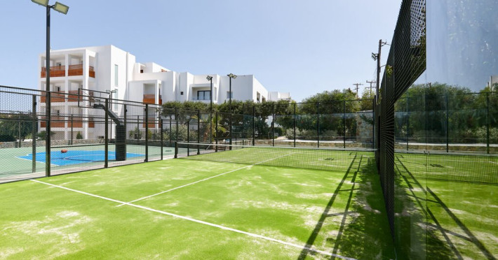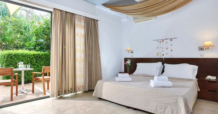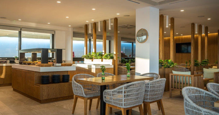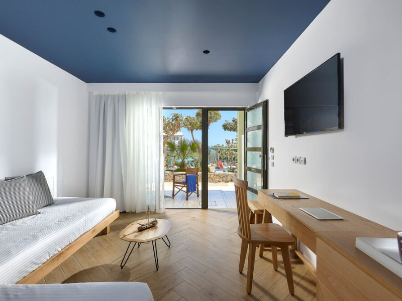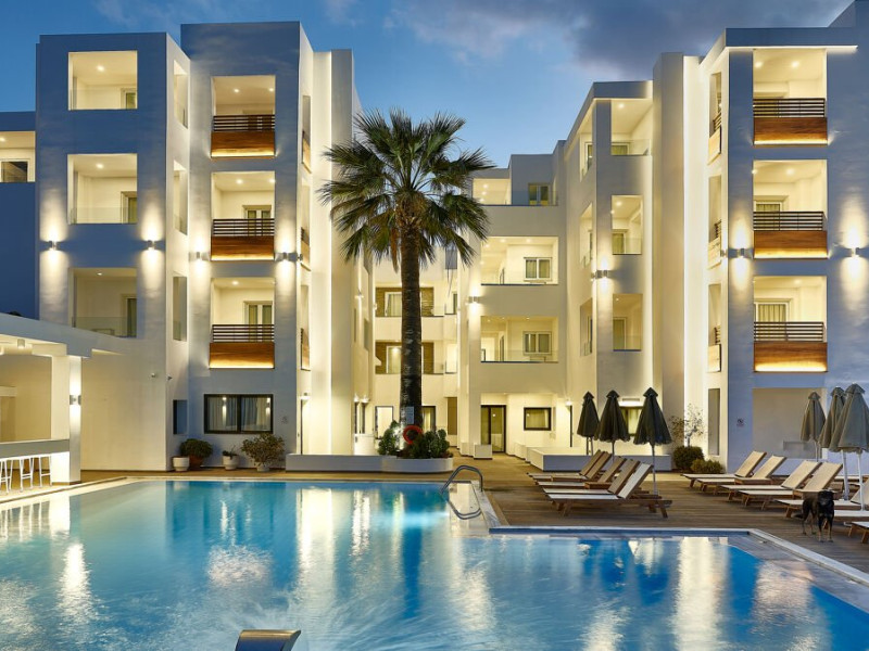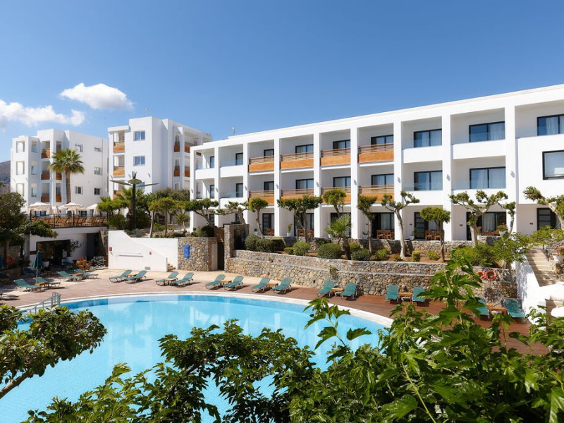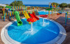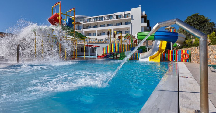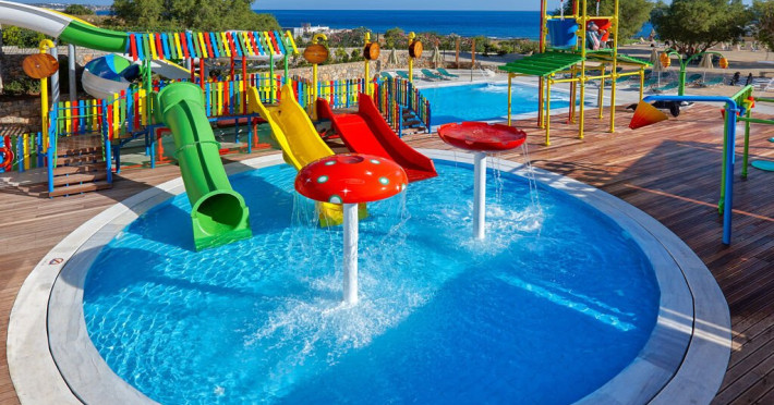 Facilitati hotel: Proprietatea pune la dispozitie patru piscine cu apa de mare, mini parc acvatic cu tobogane pentru copii si adulti, sezlonguri si umbrele gratuite la piscina, sala de fitness renovata, terenuri sportive, mini golf, padel (contra cost), sala de jocuri, parcare si o varietate de zone de relaxare. Centrul Spa ofera sauna, baie de aburi, jacuzzi, mini piscina, cabine de masaj si terapii specializate (contra cost). Oaspetii se pot bucura de restaurantul principal si barurile Votsalo, Pool Bar si Kedros. Pentru copii exista mini club, loc de joaca, piscina cu tobogane si programe zilnice de animatie.