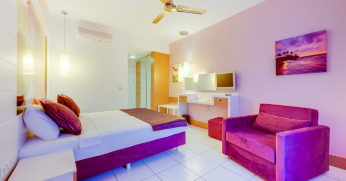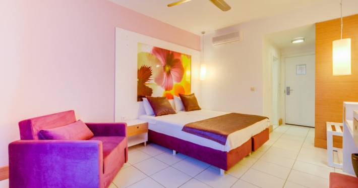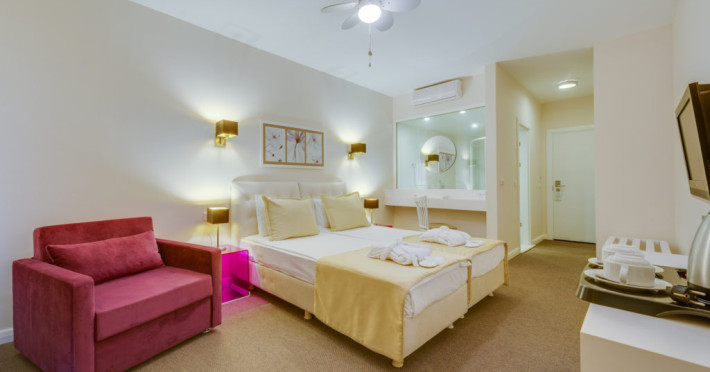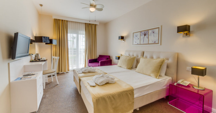 Sunt disponibile 381 camere. Camerele confortabile de la Armonia Holiday Village & Spa au pardoseală de gresie/ marmură, aer condiționat, Tv cu canale prin satelit și seif. Fiecare cameră dispune de minibar. Unele camere au balcon, cu vedere la grădină, unde oaspeții se pot relaxa în compania celor dragi. În camere există baie cu cadă sau duș prevăzută cu foehn. Oaspeții au acces gratuit la serviciul Wi-fi în camere. Curățenia in cameră se face zilnic. Proprietatea oferă camere pentru familie cu o suprafață mai mare și un număr mai mare de paturi față de cele standard.