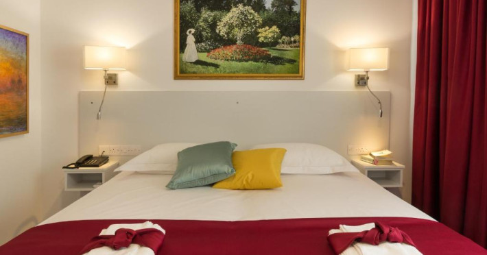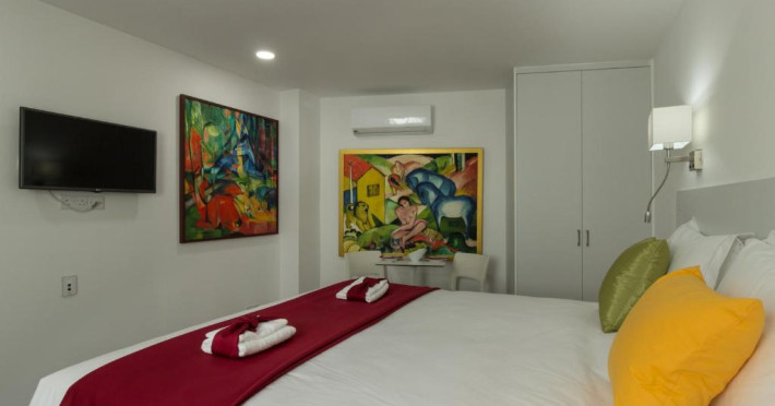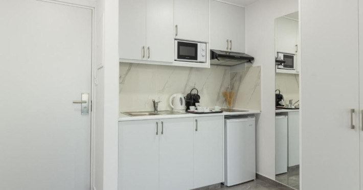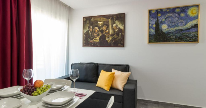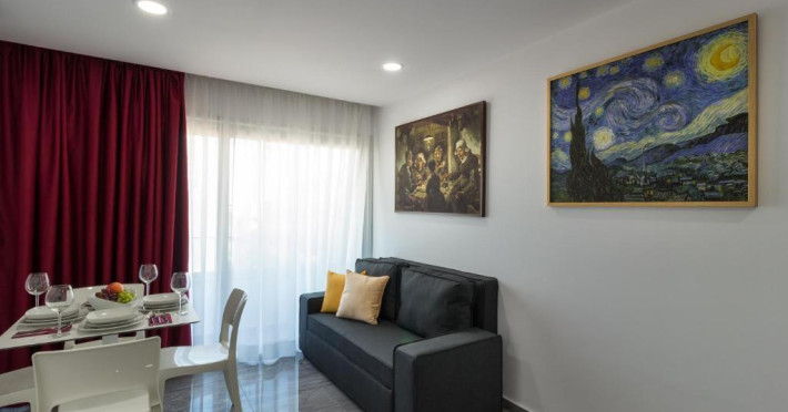 Each unit is dedicated to a specific artist and features 3 of their most famous works. They include a well-equipped kitchenette with a fridge, coffee maker, kettle, microwave, and toaster, as well as a flat-screen TV and a hairdryer. Room service is also available.