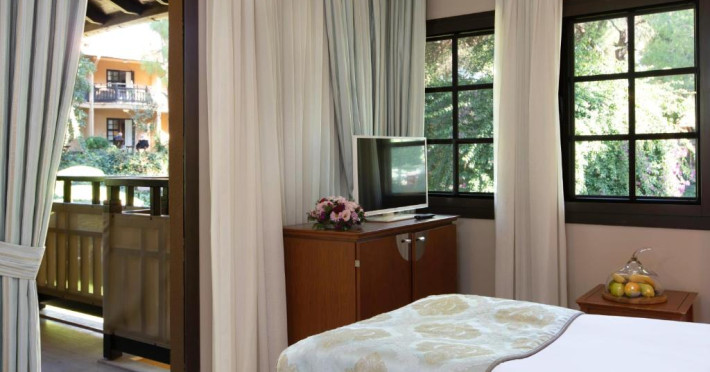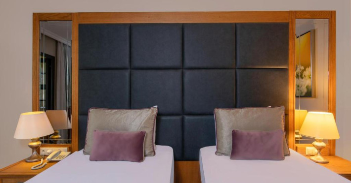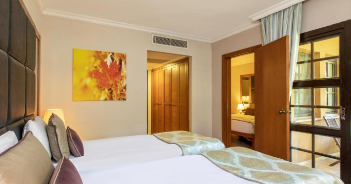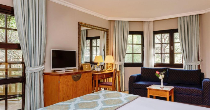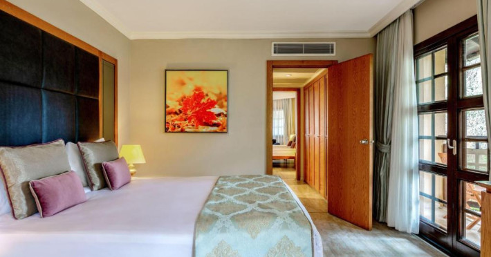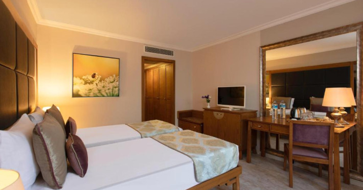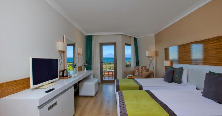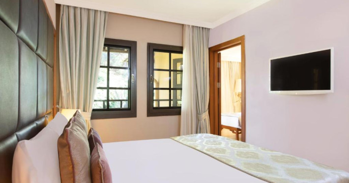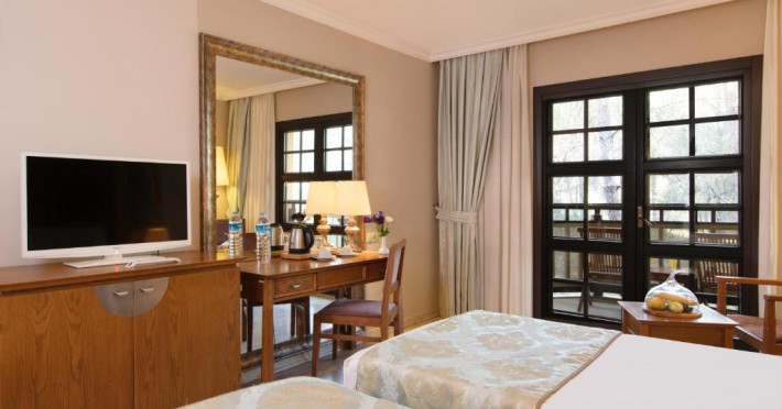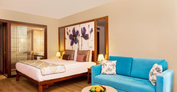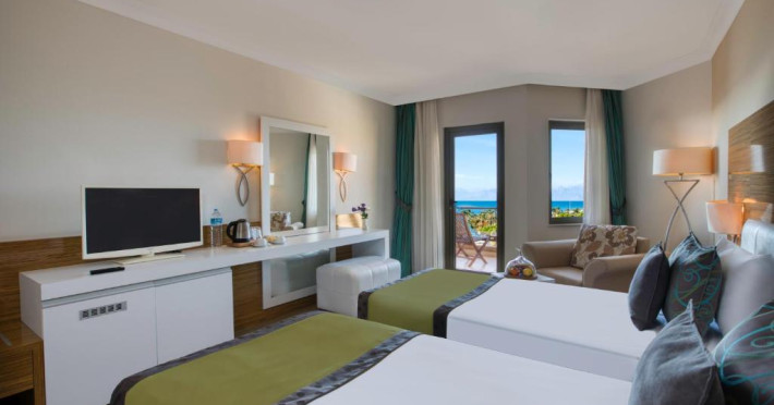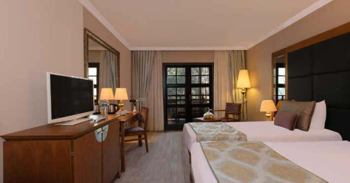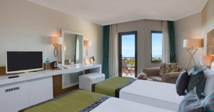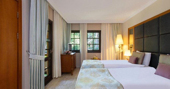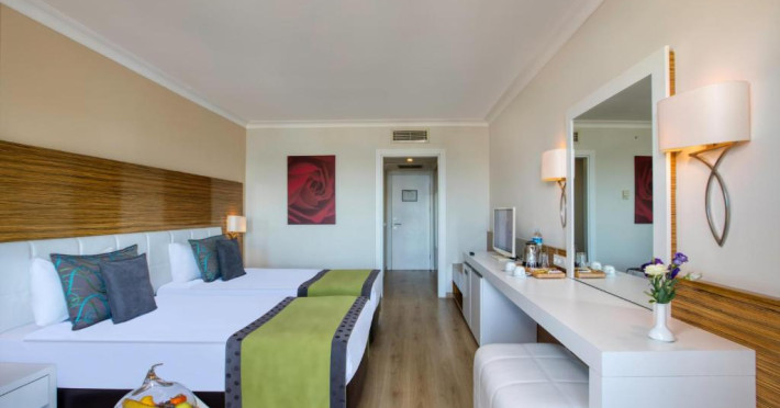 Restaurantul principal servește preparate din bucătăria internațională in sistem bufet, iar restaurantele à la carte oferă specialități din bucătăria italiană, turcească și din fructe de mare. Camerele sunt moderne și confortabile, majoritatea oferind vedere spre grădină sau piscină.