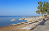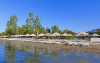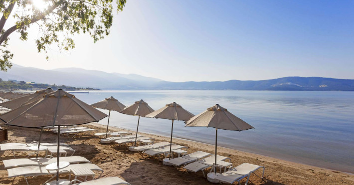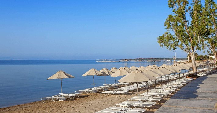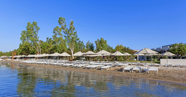 Asteria Venus Didim are în apropiere o plajă cu nisip. Pe plajă există șezlonguri și umbrele de plajă.