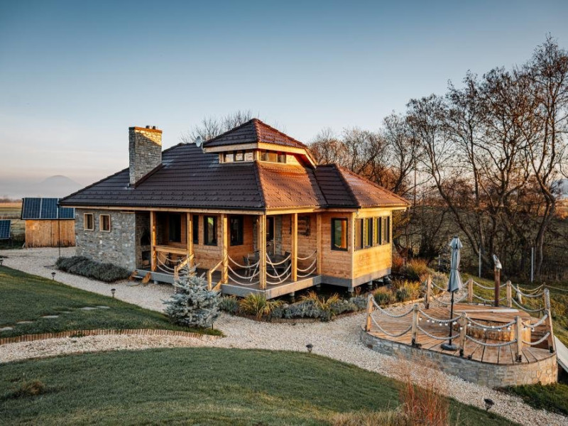 Casuta Hobbit, cu un design unic, perfecta pentru o experienta de poveste. Include un dormitor cu pat matrimonial ( 180x200 cm), o baie privata cu dus si o chicinet. Are o suprafata de 20 mp, uscator de par, TV, internet, AC, articole de toaleta, terasa, aparat de cafea, cuptor de microunde.