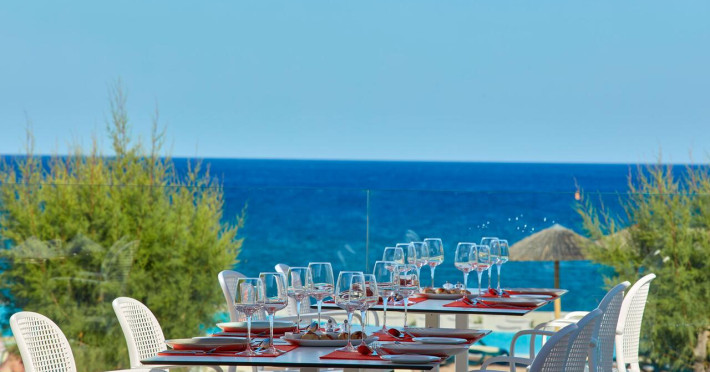 La Atlantica Aegean Blue oaspeții au la dispoziție 4 restaurante unde pot savura mâncăruri delicioase, în stil bufet sau à la carte. Preparate din bucătăria internațională și italiană sunt oferite zilnic la micul dejun, prânz și cină. Masa poate fi servită atât în interior, cît si în aer liber, pe terasă, în funcție de vreme. 4 baruri, dintre care unul la piscină, sunt disponibile cu o ofertă variată de băuturi răcoritoare și alcoolice. În cadrul proprietății există și un snack bar care servește băuturi și gustări.