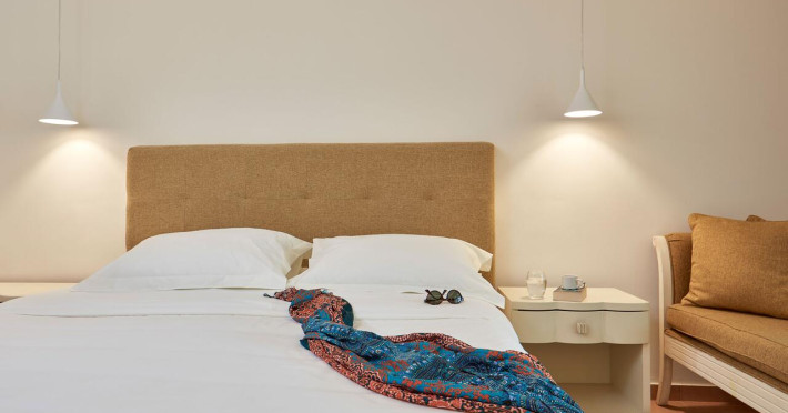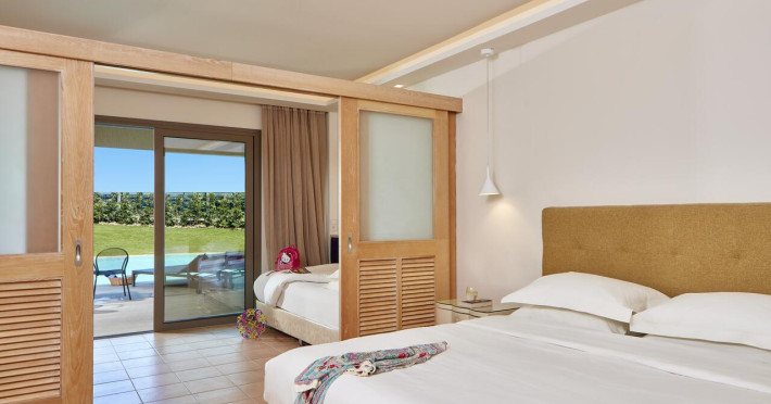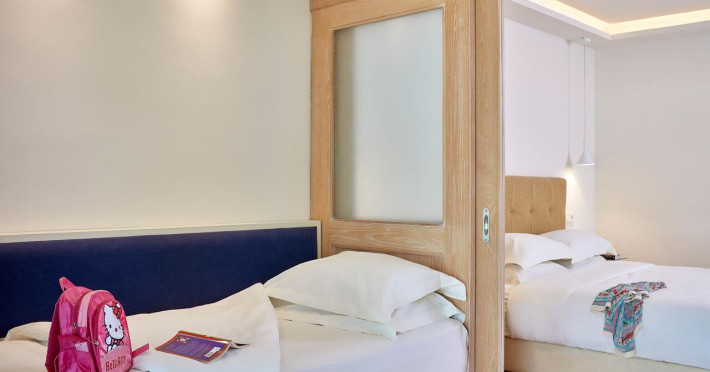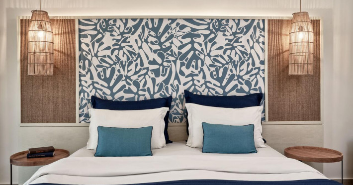 Sunt disponibile 396 camere. Unele camere au balcon cu vedere la mare, unde oaspeții pot admira apusul sau răsăritul soarelui. În camere există baie cu cadă sau duș prevăzută cu foehn. Camerele de la Atlantica Aegean Blue sunt dotate cu aer condiționat, Tv cu canale prin satelit și seif. Oaspeții au la dispoziție serviciul de room service pentru a servi masa sau diverse băuturi. Oaspeții au acces gratuit la serviciul Wi-fi în camere. Curățenia in cameră se face zilnic. Proprietatea oferă camere pentru familie cu o suprafață mai mare și un număr mai mare de paturi față de cele standard.