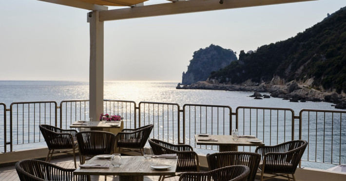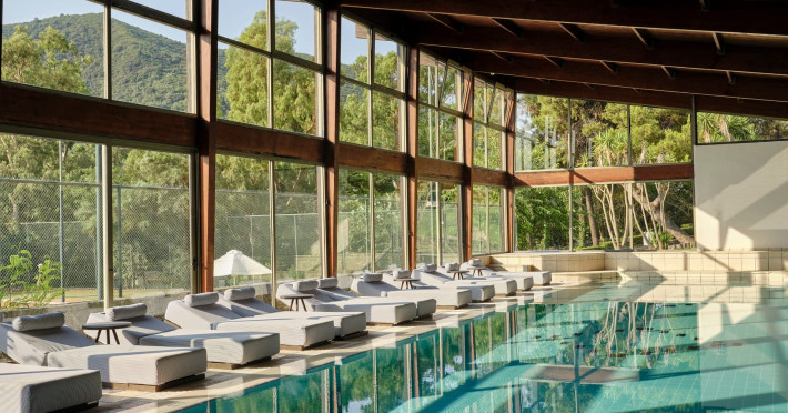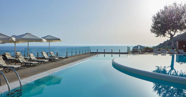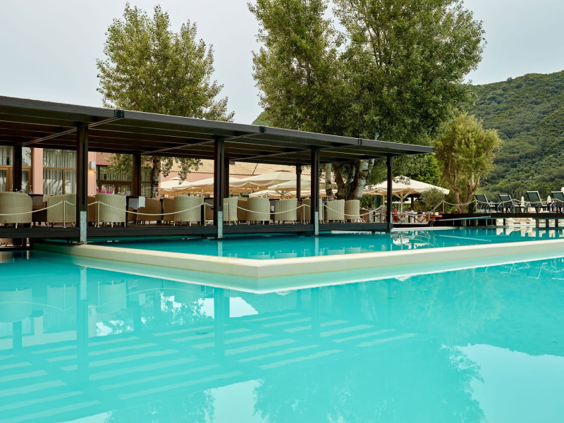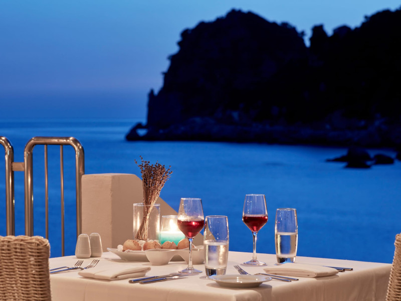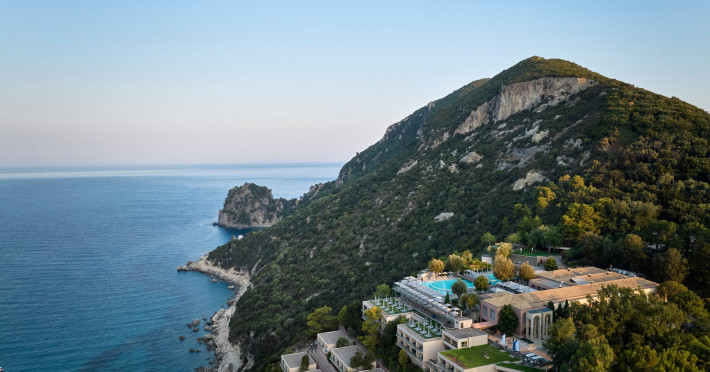 Overlooking the serene bay of western Corfu (Ermones Beach), about 25 minutes from Corfu airport and Corfu town and in very close proximity to Corfu’s Golf & Country Club, the island’s legendary resort and spa, comprises a series of intimate terraced buildings with double and deluxe rooms and suites, several with private pools. The resort spreads along 110 acres of cypress trees, eucalyptus trees and pine woods and cascades along breathtaking cliffs, offering spectacular views and dipping dramatically into the sparkling blue-turquoise Ionian Sea.