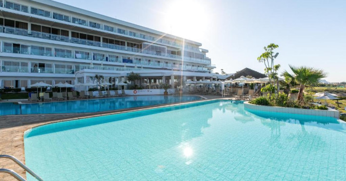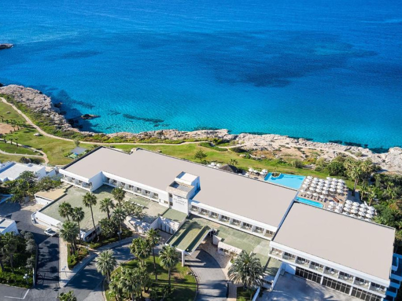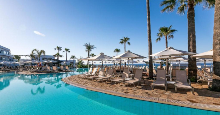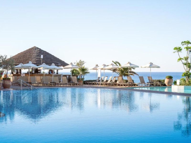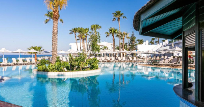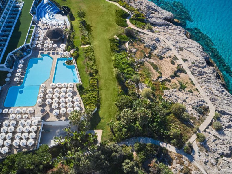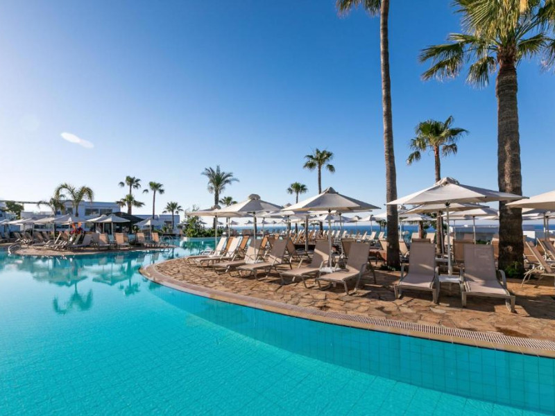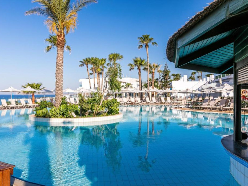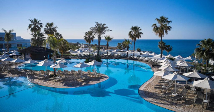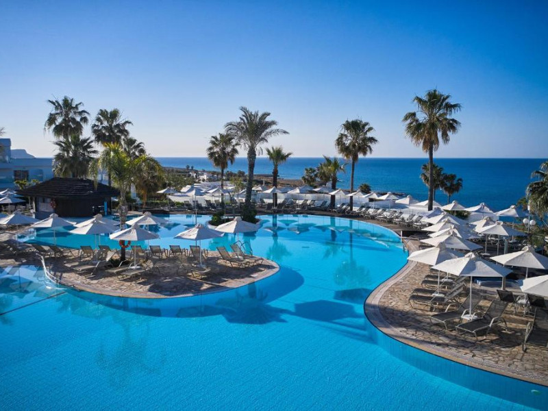 Complexul dispune de 3 piscine exterioare, inclusiv una pentru copii, și acces direct la plaja privată amenajată cu șezlonguri și umbrele. Restaurantul principal cu terasă panoramică servește preparate internaționale și cipriote, iar oaspeții pot savura băuturi răcoritoare la barul de la piscină.
