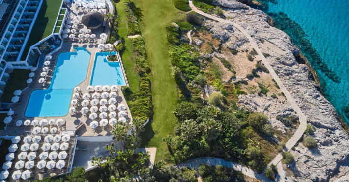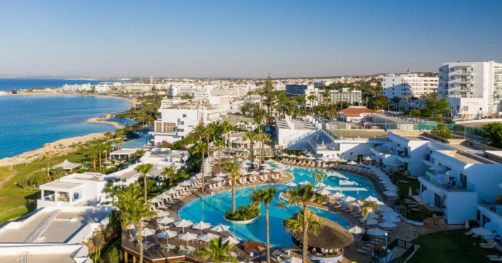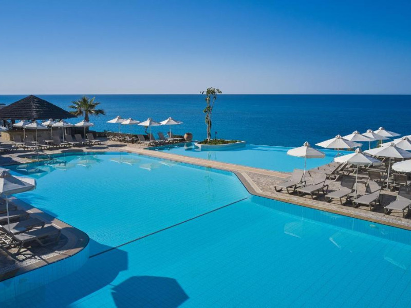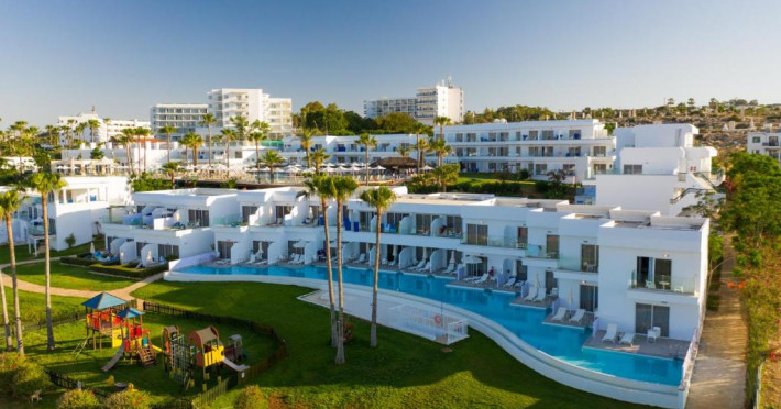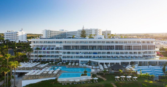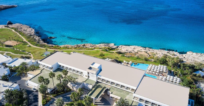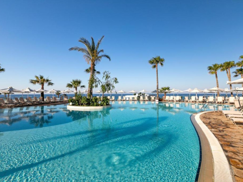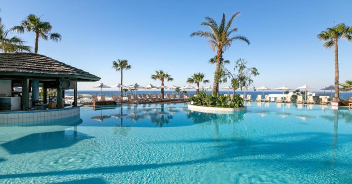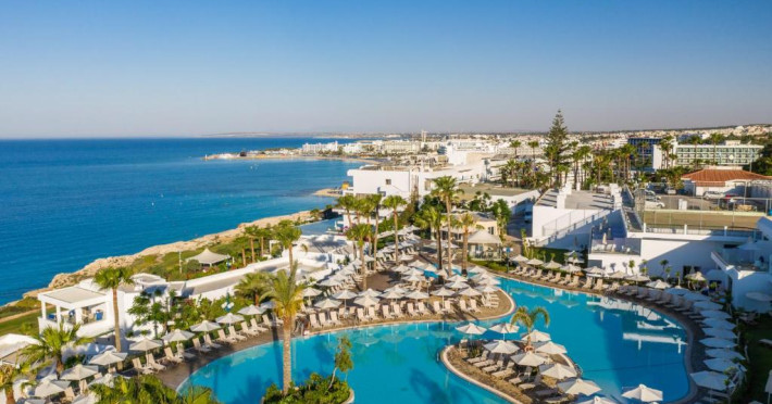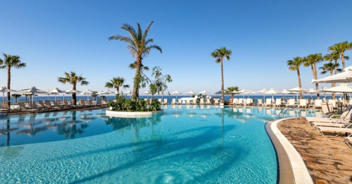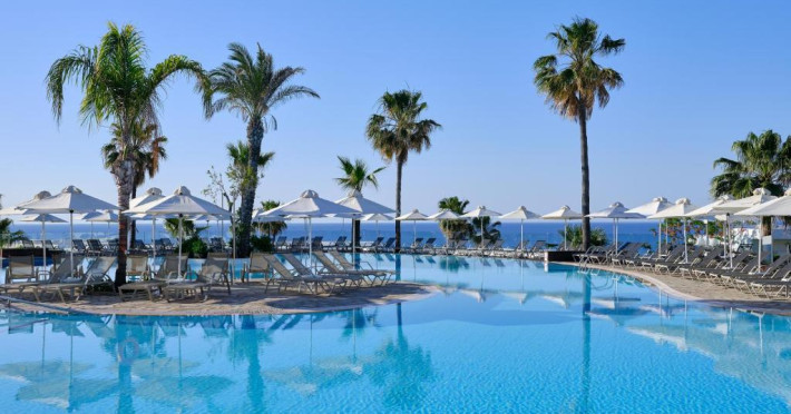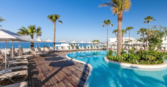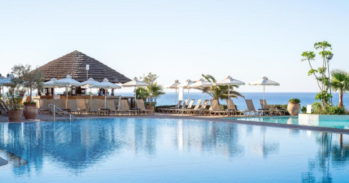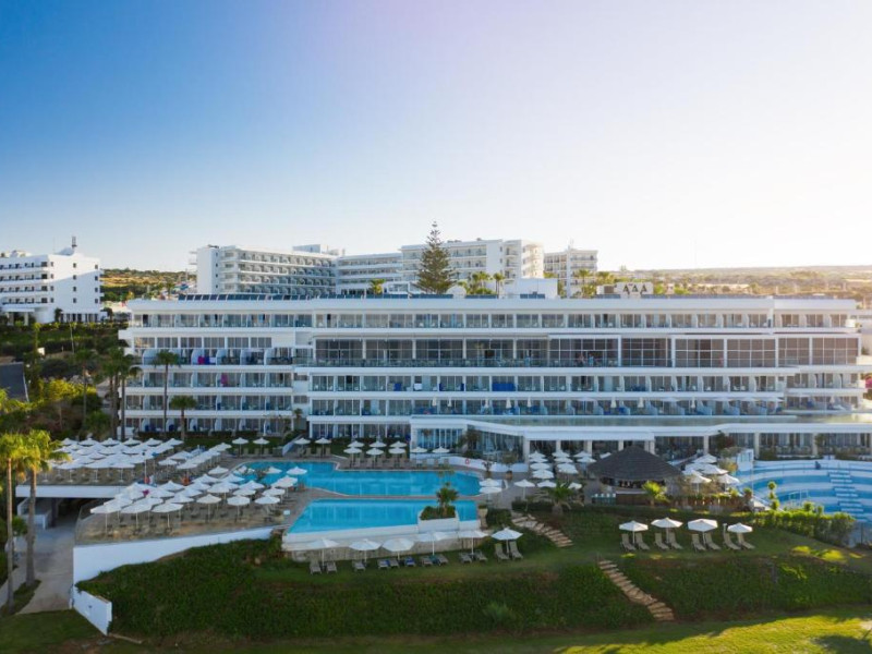 Complexul dispune de 3 piscine exterioare, inclusiv una pentru copii, și acces direct la plaja privată amenajată cu șezlonguri și umbrele. Restaurantul principal cu terasă panoramică servește preparate internaționale și cipriote, iar oaspeții pot savura băuturi răcoritoare la barul de la piscină.