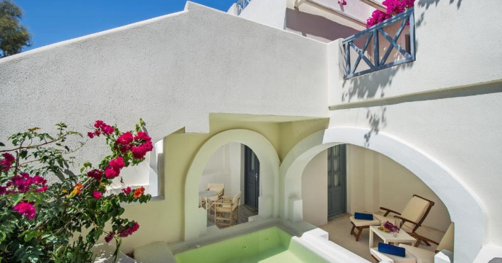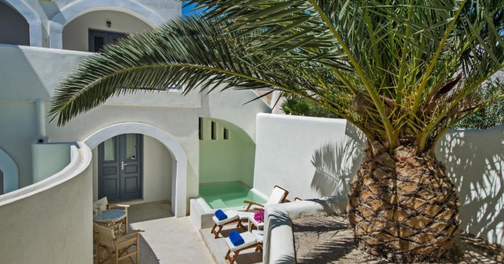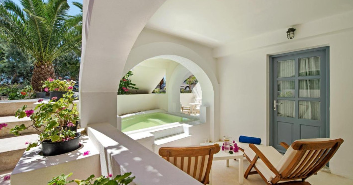 The highlight of Perivolos is of course the mesmerising black sand beach, which is the longest in Santorini and is well organized.Across Perivolos beach the visitors can find many afternoon beach bars to choose from, as well as diving and watersports activities.The hotel, built according to the traditional Cycladic architecture of Santorini, disposes of 33 rooms and studios, some of which offer a view to the beach of Perivolos.