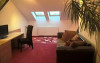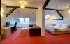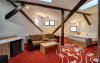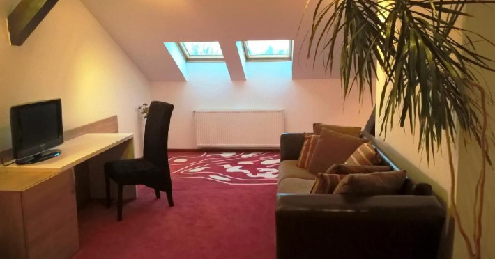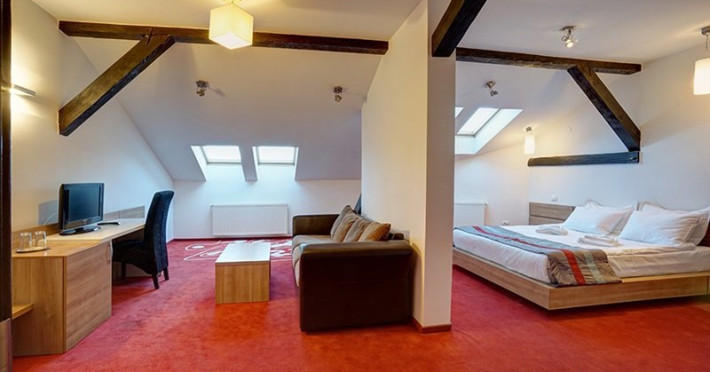 - 1 suita - dormitor cu pat matrimonial de dimensiuni 151 - 180 cm si zona de relaxare cu canapea extensibila (1 pers) si grup sanitar cu cabina de dus;
