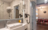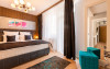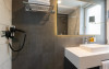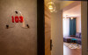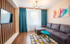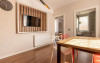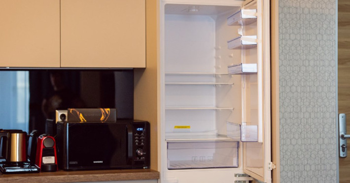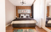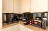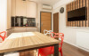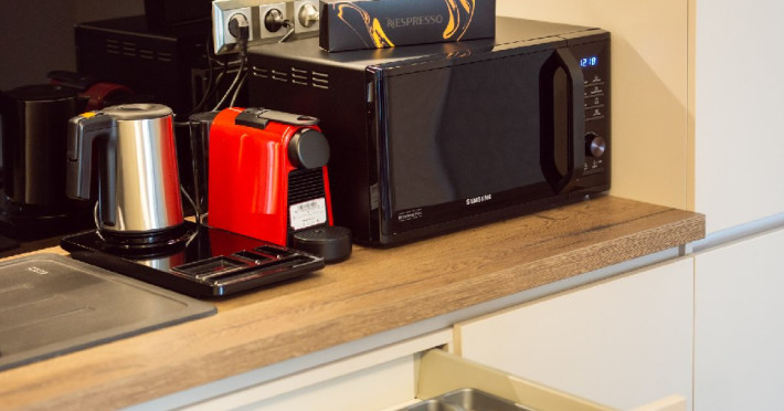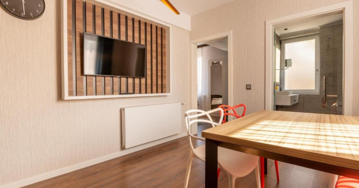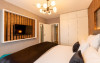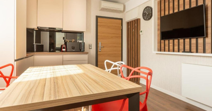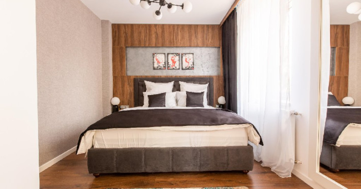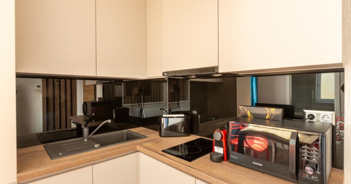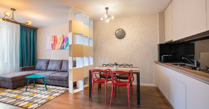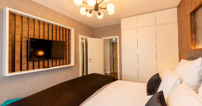 Garsoniera este compus din buctrie, complet mobilat si utilata cu plit, cuptor cu microunde, cafetiera, fierbator apa, frigider, TV LCD Samsung, masa de servit cu 4 scaune si un dormitor cu pat matrimonial cu dimensiuni de aproximativ 180/200 cm, TV LCD Samsung, noptiere cu veioza, oglinda mare, dulap haine.