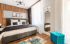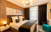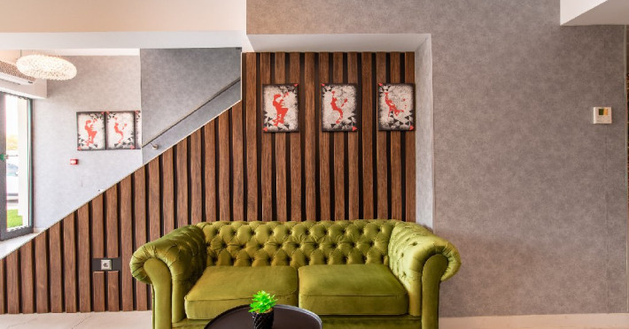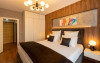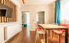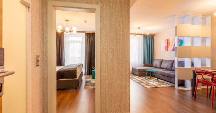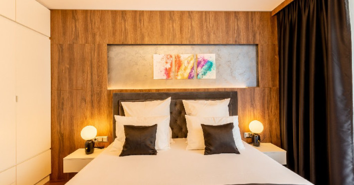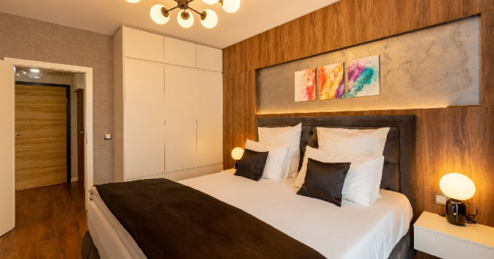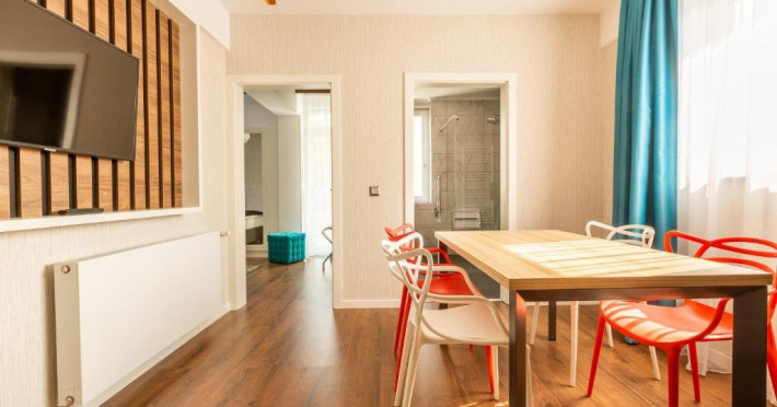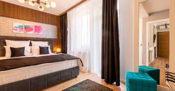Fiecare apartament este compus dintr-un living cu bucatarie open space, dotat cu TV, coltar extensibil cu masuta de cafea, masa de servit masa cu 4 scaune, bucatarie complet mobilata si utilata cu plita, cuptor cu microunde, cafetiera, fierbator apa, frigider, un dormitor cu pat matrimonial cu dimensiuni de aproximativ 180A/200 cm, TV. Baia este dotata cu cabina de dus, uscator de par, prosoape si halat de baie.