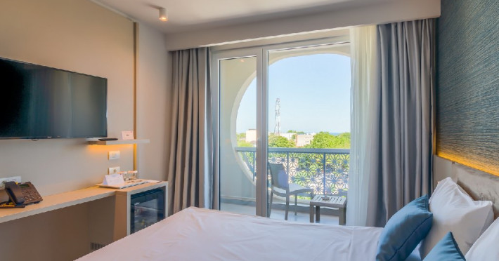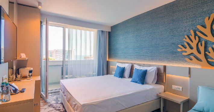 - Koralio - o camera confortabila in care spatiul si designeul au fost prioritare. Patul confortabil cu salteaua de dimensiuni de 1.80 m, culorile inspirate de maul marii si calitatea materialelor folosite ofera linistea necesara pentru relaxare. Lenjeriile din 100% bumbac, precum si celelalte materiale folosite asigura confortul necesar vacantei. Dotari camera: wi-fi, aer conditionat, tv cu ecran plat, telefon, minibar, seif, apa plata, bomboane ciocolata, papuci, articole de baie (casca baie, sapun, gel de dus, sampon, lotiune de corp), uscator de par, baie cu cabina de dus, oglinda barbierit/machiaj, birou, 2 fotolii, balcon