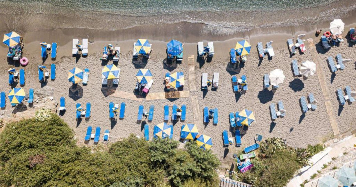 Plajă cu nisip și snack bar pe plajă (șezlonguri, foișoare, paturi de plajă și umbrele contra cost).