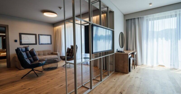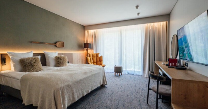 APARTAMENT CU 2 DORMITOARE - Cel mai mare si cel mai confortabil spatiu de cazare al hotelului, are 70 mp si balcon, este ideal pentru acomodarea a doua familii sau a unei familii cu mai multi copii. Structura apartamentului: un dormitor Queen si unul Twin, un living room intre ele, si o terasa imensa, cu cea mai frumoasa priveliste din hotel.