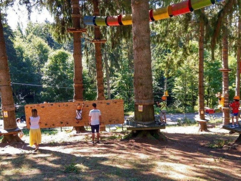 DESCRIERE UNITATE DE CAZARE: Complet renovat, ridicat la standarde de patru stele, situat in mijlocul padurilor ce inconjoara Lacul Sf. Ana, Grand Hotel Balvanyos**** se bucura de un cadru natural care imbina linistea si aerul proaspat al peisajului montan cu valoarea de exceptie a locatiei, in asa fel incat hotelul a devenit, probabil, cea mai atractiva destinatie pentru recreere si relaxare, dar mai ales pentru reusita intalnirilor de afaceri, conferintelor si seminariilor. Parcul de aventura este alcatuit dintr-o serie de elemente suspendate pe copaci sau piloane (scari, poduri, tuneluri construite din lemn si corzi) care se pot parcurge in conditii de maxima siguranta folosind echipamentul de alpinism realizat special pentru aceasta forma de activitate.
