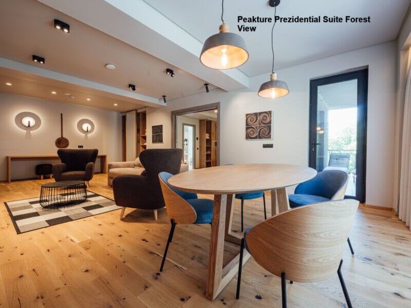 Peakture Presidential Suite Vedere la padure - Apartament presidential cu vedere spre padure cu o suprafata totala de 70 m2 cu living spatios, 1 dormitor si balcon mare. Este ideala pentru maxim 4 persoane optional cu canapea extensibila in living. Apartamentul este dotat cu aer conditionat, TV cu ecran plat, prin satelit, seif electronic, mini-bar, facilitati de preparare a cafelei si ceaiului in camera, Wi-Fi gratuit, incuietoare electronica la usi. Bai echipate modern, cu dus, uscator de par, oglinda cosmetica, articole de toaleta.