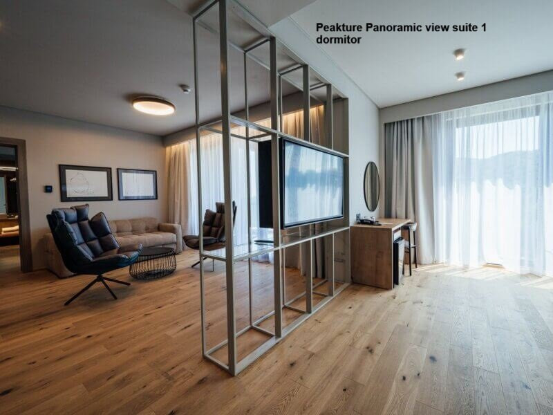 Peakture Panoramic View Suite cu 2 Dormitoare - Apartament confortabil cu vedere panoramica spre muntii inconjuratori avand o suprafata totala de 64 m2 cu living si 2 dormitoare. Este ideala pentru 4 sau maxim 5 persoane, optional cu canapea extensibila in living. Apartamentul este dotat cu aer conditionat, TV cu ecran plat, prin satelit, seif electronic, mini-bar, facilitati de preparare a cafelei in camera, Wi-Fi gratuit, incuietoare electronica la usi. Are 2 bai echipate modern, cu dus, uscator de par, oglinda cosmetica, articole de toaleta pentru oaspeti, prosoape pufoase.