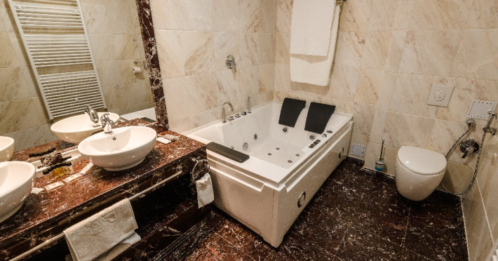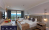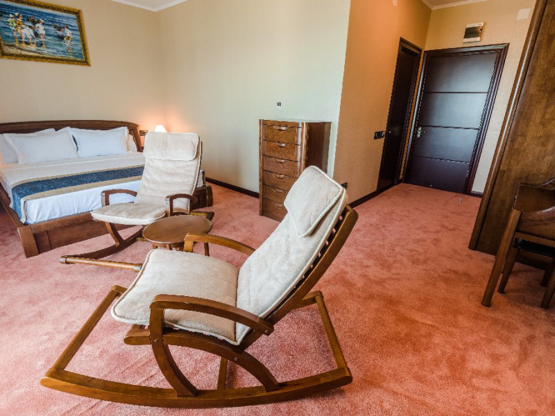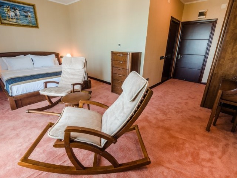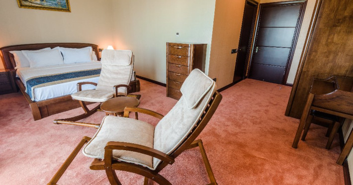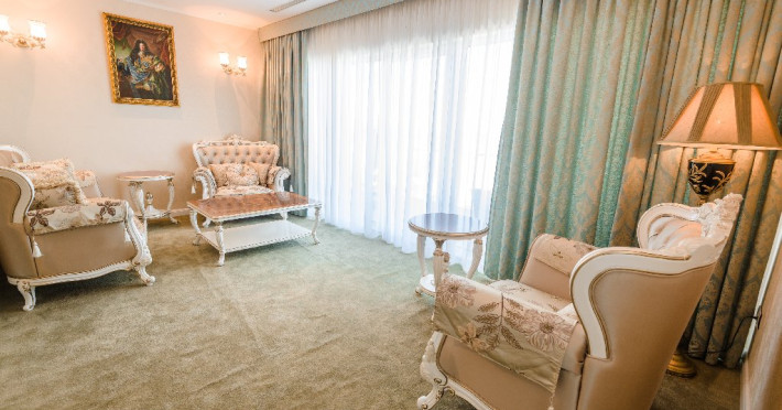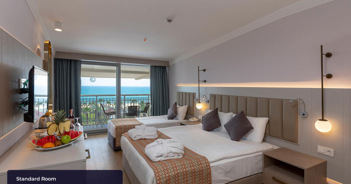 Apartament deluxe standard/vedere mare au o suprafata de 42/52/68 mp + 12 mp balcon sau 68 mp + 24 mp cu pat matrimonial cu dimensiunea de 180x200 cm.Permite acomodarea: minim 1 adult/ maxim 2 adulti.Camerele sunt la etajul 5, au internet Wi-fi, telefon, smart TV/TV LCD prin cablu, birou de lucru, seif, minibar,mocheta, climatizare, sisteme de alarma in caz de incendiu, detectoare de fum, jacuzzi cu hidromasaj, TV si radio rezistent la apa, priza modulara, oglinda cosmetica, uscator de par, set igiena, papuci si halat de baie.