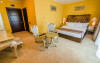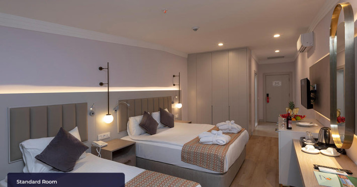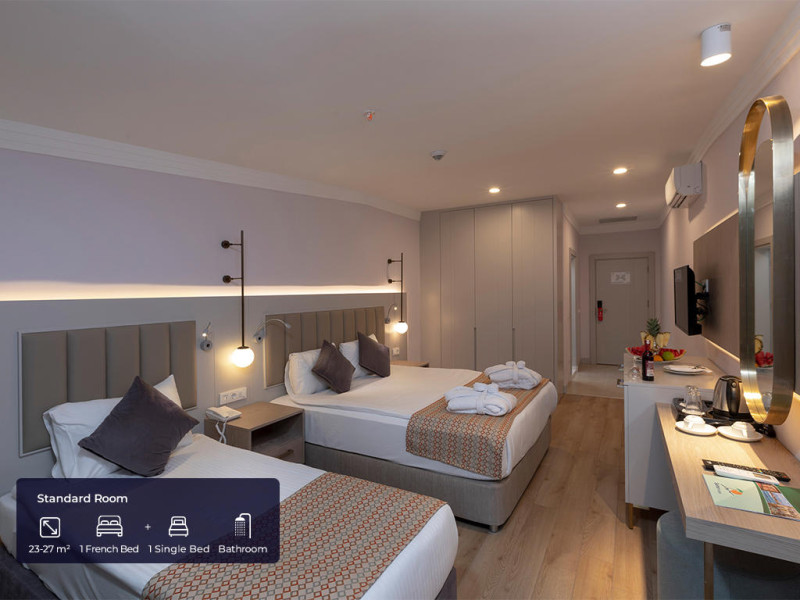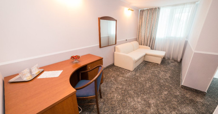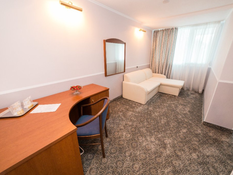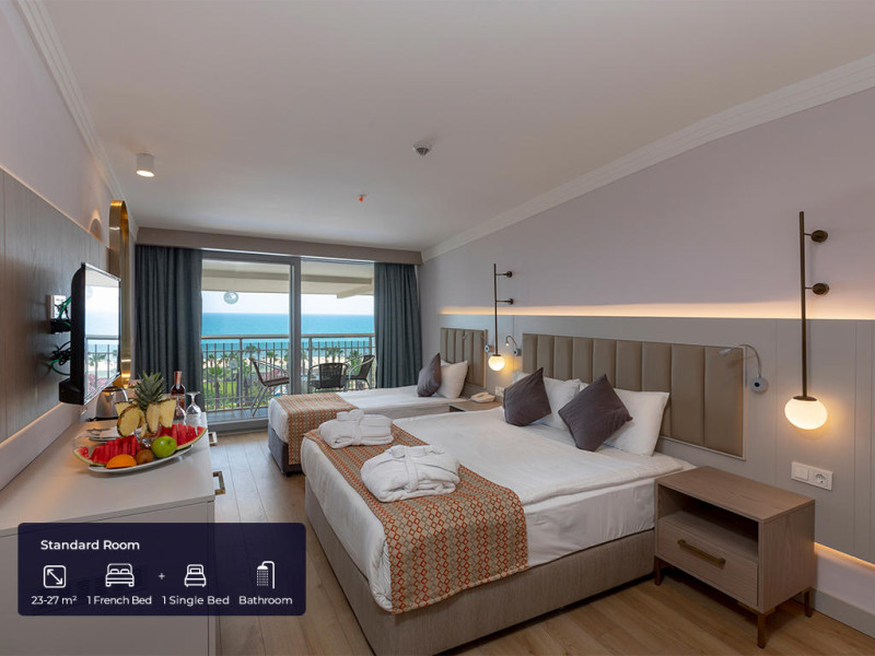 Studio standard/ vedere mare au o suprafata de 32 mp, reprezinta spatiul de cazare care permite acomodarea a minim 2 adulti si 2 copii sub 13.99 ani sau 3 adulti .Dispune de 1 dormitor cu pat matrimonial cu dimensiunea de 180x200 cm sau twin cu dimensiunea de 90x200 cm + 1 living cu 1 canapea extensibila cu dimensiunea de 130x190 cm, legatura facandu-se cu arcada (fara usa intre ele).Camerele au internet Wi-fi, telefon, smart TV/TV LCD prin cablu, birou de lucru, seif, minibar,mocheta, climatizare, sisteme de alarma in caz de incendiu, detectoare de fum, baie cu cabina de dus,priza, oglinda cosmetica, uscator de par, set igiena, papuci si halat de baie.