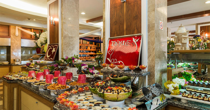 ciorbe/ supe (2 tipuri), aperitive reci/ calde, fel principal - pui, porc, curcan, vita/ miel, peste, fructe de mare, paste, pizza, salate, desert (4-5 tipuri de prajituri), fructe, apa minerala/ plata, Coca Cola/ Fanta/ Sprite, 3 tipuri de suc natural, cafea si ceai