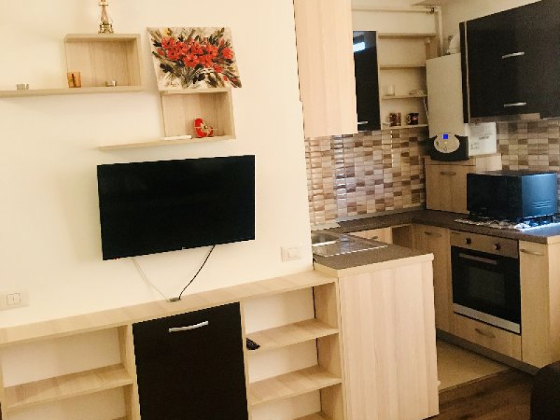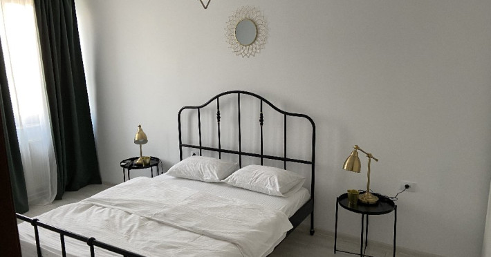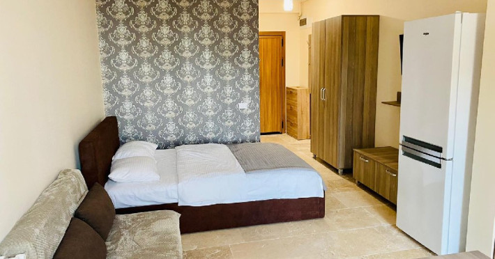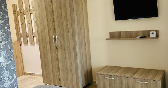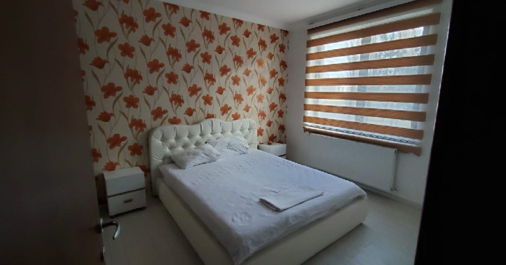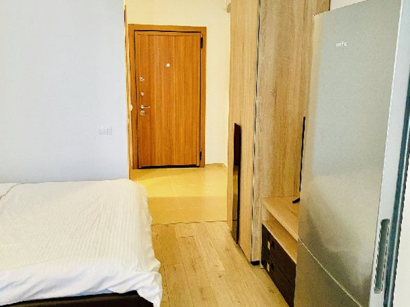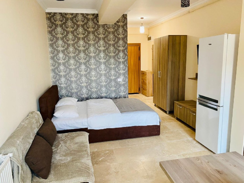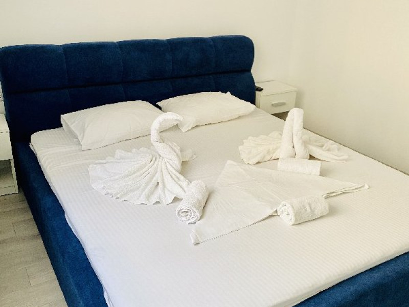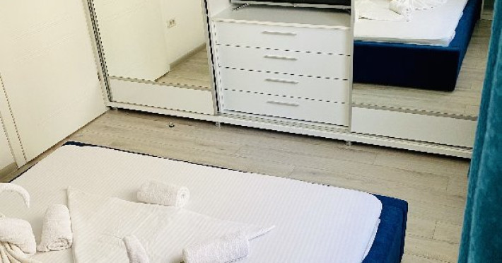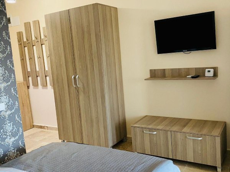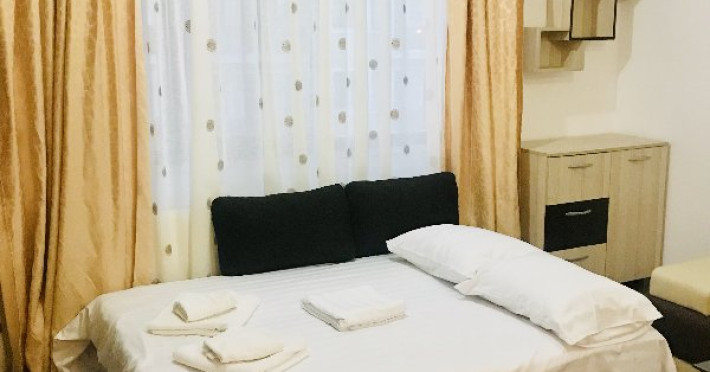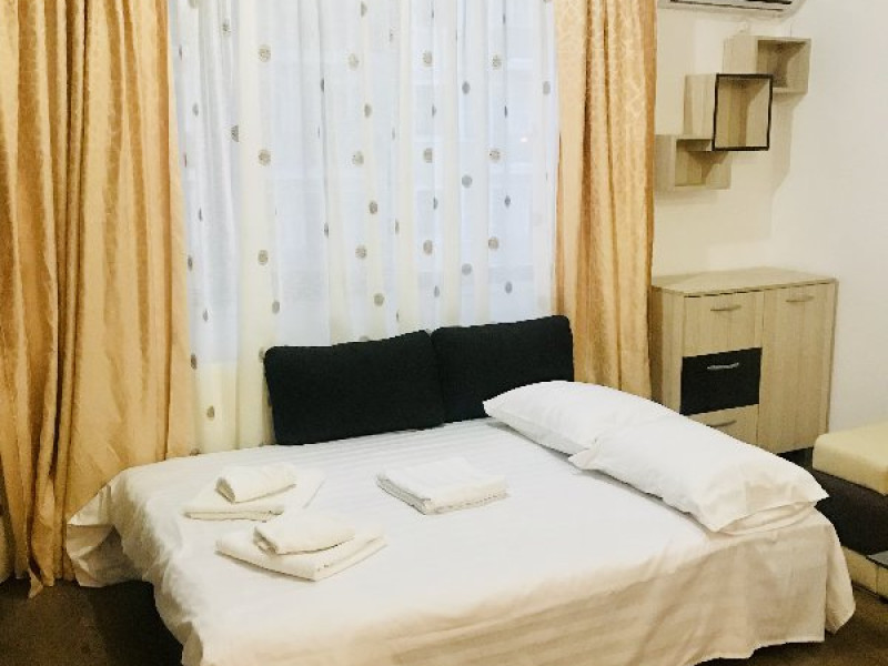 Garsoniere 1 camera cu pat matrimonial plus canapea extensibila , bucatarie complet mobilata si utilata, baie dotata cu cabina de dus. Garsoniera poate acomoda 4 adulti sau 2 adulti plus 2 copii .