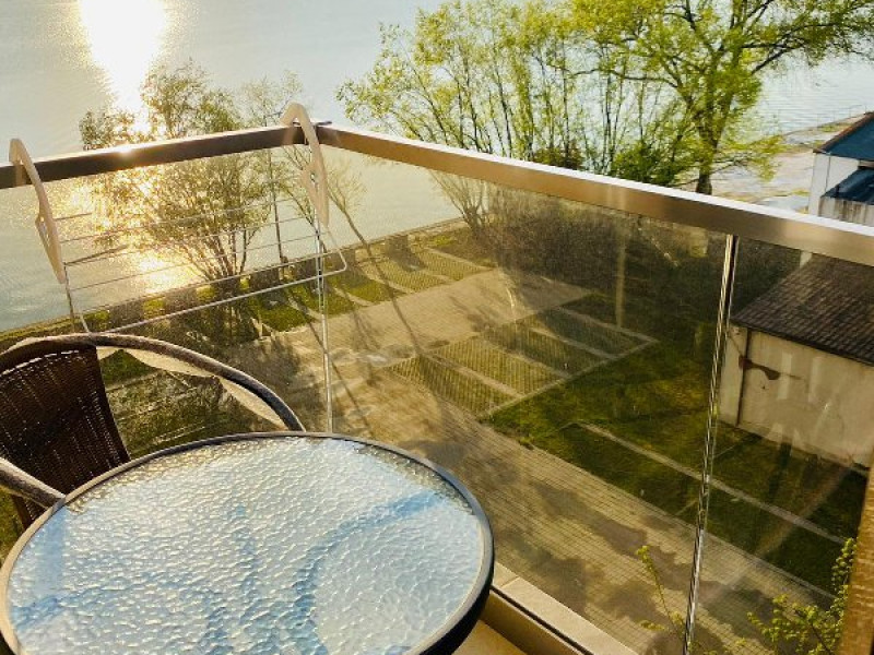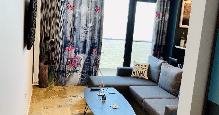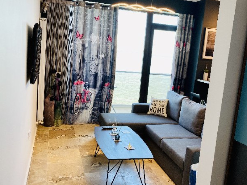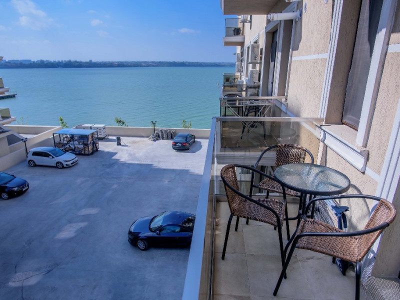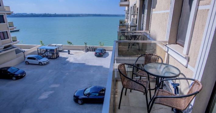 Apartamentele sunt alcatuite din 2 camere: living, 1 dormitoar , bucatarie complet mobilata si utilata, baie dotata cu cabina de dus si terasa . Dormitoarul are un pat dublu matrimonial 160/200, iar living-ul detine o canapea extensibila . Toate spatiile sunt generoase, amenajate ultramodern. Apartamentele au vedere la lac din balcon.