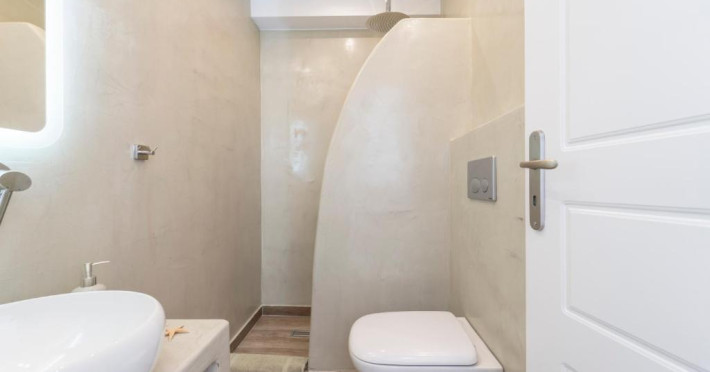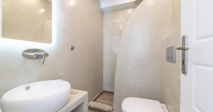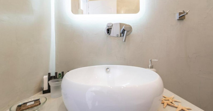 Bella Santorini are acces la o plajă publică. Pe plajă există șezlonguri și umbrele de plajă contra cost.