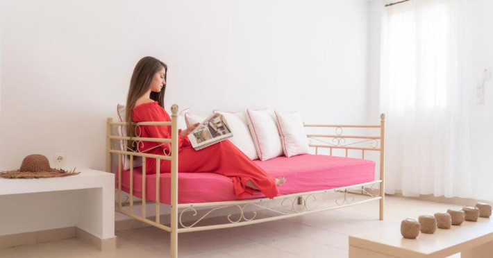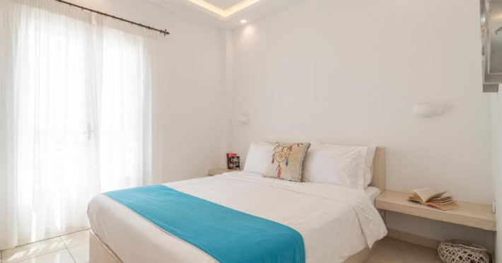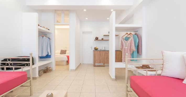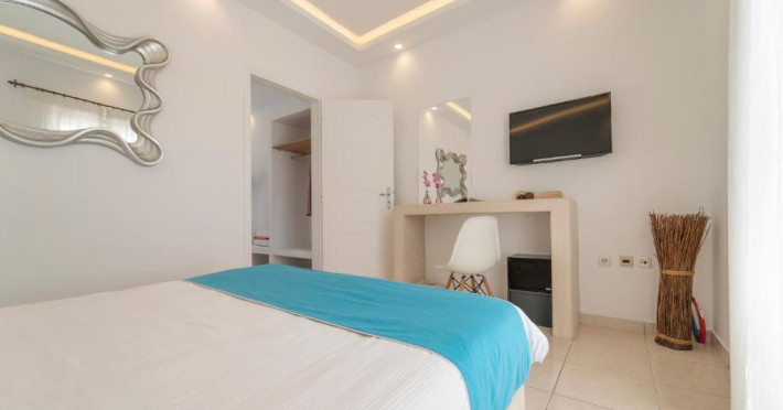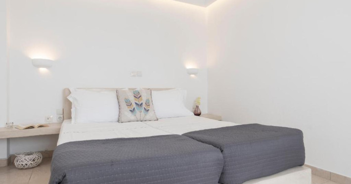 Camerele luminoase de la Bella Santorini sunt dotate cu aer condiționat, Tv și seif. Fiecare cameră dispune de minibar. Oaspeții pot solicita serviciul de room service pentru a servi masa sau diverse băuturi. În camere există baie cu duș prevăzută cu foehn. Oaspeții au acces gratuit la serviciul Wi-fi în camere. Curățenia in cameră se face zilnic. Proprietatea oferă camere pentru familie cu o suprafață mai mare și un număr mai mare de paturi față de cele standard.
