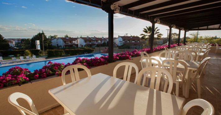 La Bellagio Blue oaspeții au la dispoziție un restaurant care servește mâncare în stil bufet. Preparate din bucătăria grecească și internațională așteaptă să fie degustate în fiecare zi la micul dejun, prânz și cină. Masa poate fi servită atât în interior, cît si în aer liber, pe terasă, în funcție de vreme. Oaspeţii pot avea diverse băuturi răcoritoare sau alcoolice la bar. În cadrul proprietății există și o cafenea ideală pentru o gustare rapidă.