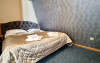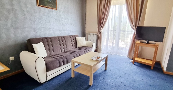 Apartament: dispuse pe toate etajele, dormitor cu pat matrimonial si living cu canapea.