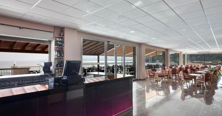 Piscina in aer liber și terasa au vedere la mare, iar la piscină există un snack bar.