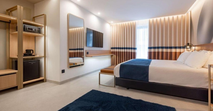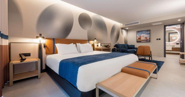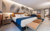 Camera Deluxe cu vedere laterala la mare aproximativ 35 metri patrati, balcon cu vedere partiala la mare, decor modern, facilitati pentru ceai si cafea, minibar, seif.