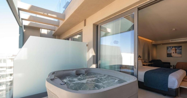 Junior Suite cu jacuzzi aproximativ 34 metri patrati, terasa privata, jacuzzi exterior, zona de relaxare, pat king-size, vedere panoramica.