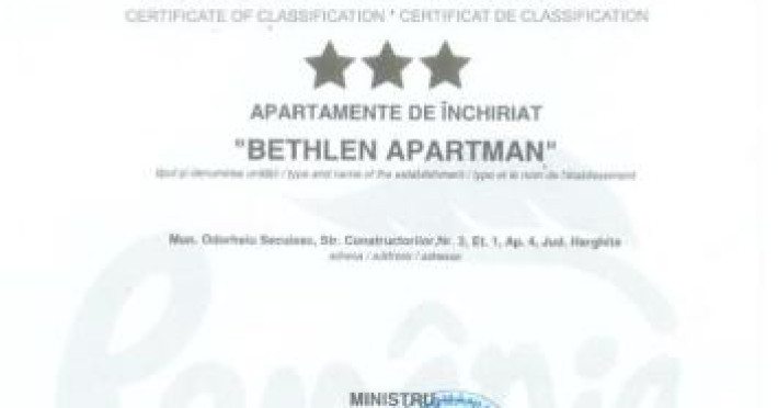 If you want to feel like youre at home no matter where you are, choose this apartment Bethlen Apartman is located in Odorheiu Secuiesc. This apartment is located minutes away from the city center.If you want to feel like youre at home no matter where you are, choose this apartment Bethlen Apartman is located in Odorheiu Secuiesc. This apartment is located minutes away from the city center.You can stop by the bar. Free Wi-Fi on the territory will help you to stay on-line. Specially for tourists who travel by car, theres a parking zone. The following services are also available for the guests: a doctor.There are other services available for the guests of the apartment. For example, a laundry and a safe-deposit box.You can stop by the bar. Free Wi-Fi on the territory will help you to stay on-line. Specially for tourists who travel by car, theres a parking zone. The following services are also available for the guests: a doctor.There are other services available for the guests of the apartment. For example, a laundry and a safe-deposit box.In the room, for you, there is a shower, a TV and slippers. The room equipment depends on its category.In the room, for you, there is a shower, a TV and slippers. The room equipment depends on its category.This property will not accommodate hen, stag or similar parties. Please inform Bethlen Apartman in advance of your expected arrival time. You can use the Special Requests box when booking, or contact the property directly with the contact details provided in your confirmation. Managed by a private hostDatorita dinamicitatii domeniului disponibilitatea ofertelor se modifica de la un moment la altul. De aceea ofertele sunt valabile in limita locurilor disponibile. Agentia nu este responsabila pentru eventualele neconcordante care pot aparea intre informatiile privind tarifele si alte detalii din site si informatiile primite in agentie. In aceste cazuri vor avea prioritate, intotdeauna, informatiile primite in agentie.