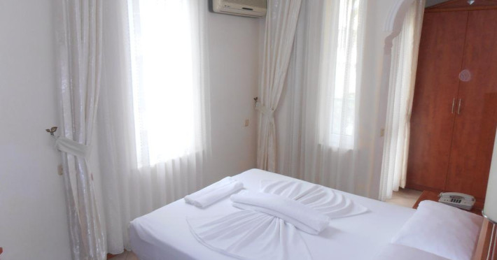 Camerele confortabile de la Beyaz Melek sunt dotate cu pardoseală de gresie/ marmură, aer condiționat și Tv. În camere există baie cu articole de toaletă gratuite. Unele camere au balcon cu vedere la grădină sau la piscină. Oaspeții au acces gratuit la serviciul Wi-fi în camere. Curățenia in cameră se poate asigura zilnic, contra cost. Proprietatea oferă camere pentru nefumători.