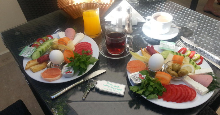 Beyaz Melek pune la dispoziția oaspeților un restaurant. Bucătăria turcească de la Beyaz Melek propune preparate delicioase care satisfac gusturi diverse. Masa poate fi servită atât în interior, cît si în aer liber, pe terasă, în funcție de vreme. Oaspeţii pot avea diverse băuturi răcoritoare sau alcoolice la bar.