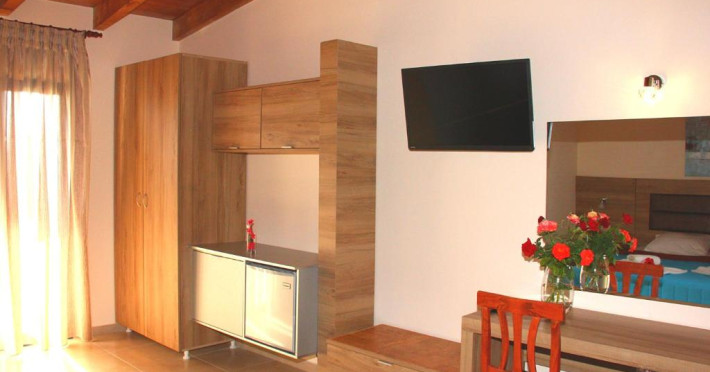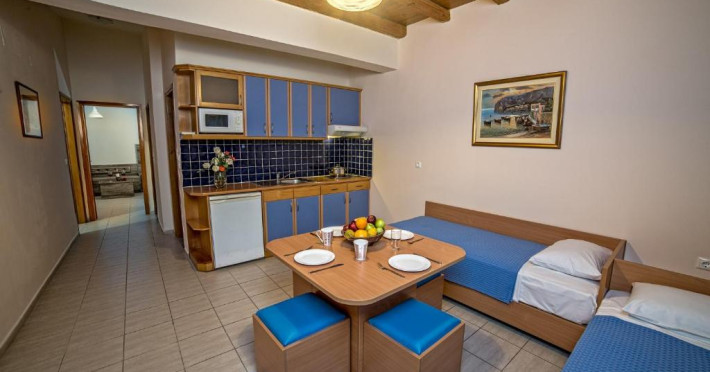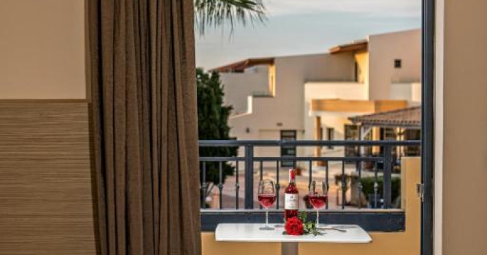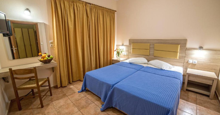 Sunt disponibile 58 camere. Unele camere au balcon, cu vedere la piscină, unde oaspeții se pot relaxa în voie. În camere există baie cu cadă sau duș ce are în dotare foehn și articole de toaletă gratuite. Camerele luminoase de la Blue Aegean Hotel And Suites sunt dotate cu aer condiționat, Tv și seif. Fiecare cameră dispune de mașină pentru preparare cafea sau ceai și fierbător Oaspeții au acces gratuit la serviciul Wi-fi în camere. Curățenia in cameră se face zilnic. Anumite camere au cadă cu hidromasaj care asigură un plus de confort și răsfăț. Fiecare unitate de cazare include o chicinetă utilată cu frigider, plită de gătit și ustensile de bucătărie. De asemenea, sunt disponibile o zonă de luat masa și un cuptor cu microunde. Proprietatea oferă camere pentru familie cu o suprafață mai mare și un număr mai mare de paturi față de cele standard.