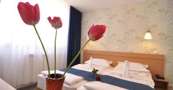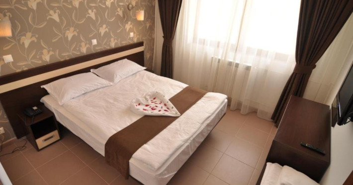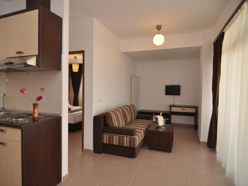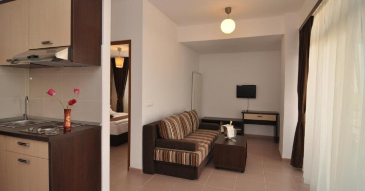 Camere: Apartamentele dispun de: dormitor cu pat matrimonial sau 2 paturi separate(twin), TV LCD; living cu canapea extensibila (de 1 sau 2 persoane), masa, TV LCD; bucatarie utilata cu plita electrica, hota, spalator, vesela, tacamuri, frigider; baie cu cabina de dus / cada; internet wi-fi si aer conditionat.